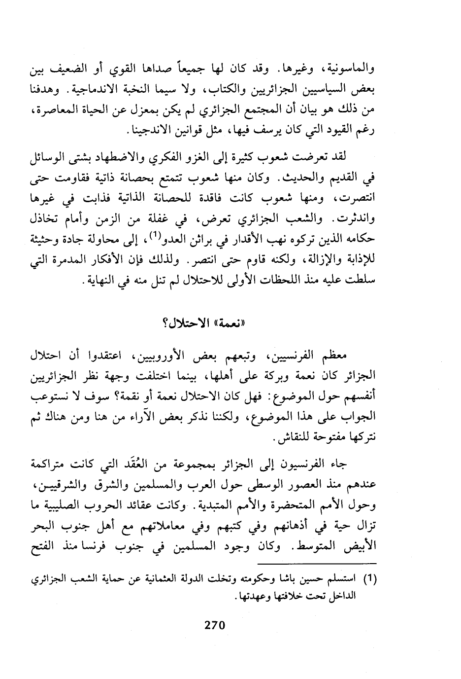 والماسونية، وغيرها. وقد كان لها جميعا صداها القوي أو الضعيف بين بعض السياسيين الجزائريين والكتاب، ولا سيما النخبة الاندماجية. وهدفنا من ذلك هو بيان أن المجتمع الجزائري لم يكن بمعزل عن الحياة المعاصرة، رغم القيود التي كان يرسف فيها، مثل قوانين الاندجينا.