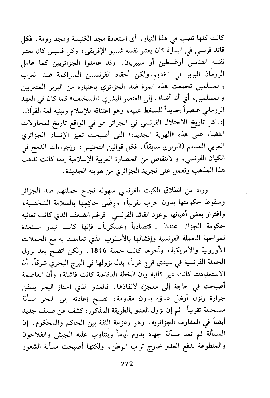 كانت كلها تصب في هذا التيار، أي استعادة مجد الكنيسة ومجد رومة. فكل قائد فرنسي في البداية كان يعتبر نفسه شيبيو الإفريقي، وكل قسيس كان يعتبر نفسه القديس أوغسطين أو سيبريان. وقد عاملوا الجزائريين كما عامل الرومان البربر في القديم، ولكن أحقاد الفرنسيين المتراكمة ضد العرب والمسلمين تجمعت هذه المرة ضد الجزائري باعتباره من البربر المتعربين والمسلمين، أي أنه أضاف إلى العنصر البشري (المتخلف) كما كان في العهد الروماني عنصرا جديدا للسخط عليه، وهو اعتناقه للإسلام وتبنيه لغة القرآن. إن كل تاريخ الاحتلال الفرنسي في الجزائر هو في الواقع تاريخ لمحاولات القضاء على هذه (الهوية الجديدة) التي أصبحت تميز الإنسان الجزائري العربي المسلم (البربري سابقا). فكل قوانين التجنيس، وإجراءات الدمج في الكيان الفرنسي، والانتقاص من الحضارة العربية الإسلامية إنما كانت تذهب هذا المذهب وتعمل على تجريد الجزائري من هويته الجديدة.