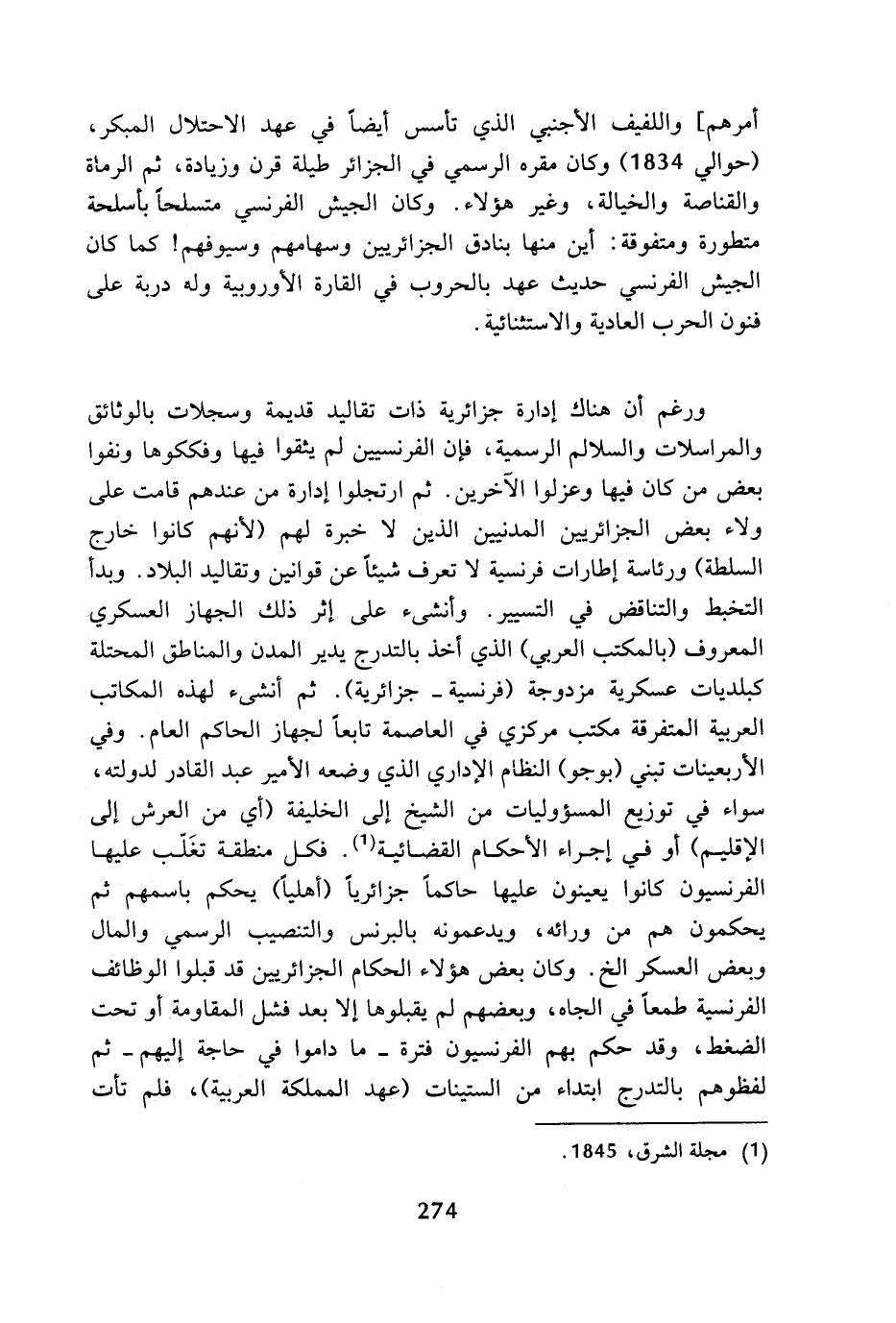 ورغم أن هناك إدارة جزائرية ذات تقاليد قديمة وسجلات بالوثائق والمراسلات والسلالم الرسمية، فإن الفرنسيين لم يثقوا فيها وفككوها ونفوا بعض من كان فيها وعزلوا الآخرين. ثم ارتجلوا إدارة من عندهم قامت على ولاء بعض الجزائريين المدنيين الذين لا خبرة لهم (لأنهم كانوا خارج السلطة) ورئاسة إطارات فرنسية لا تعرف شيئا عن قوانين وتقاليد البلاد. وبدأ التخبط والتناقض في التسيير. وأنشئ على إثر ذلك الجهاز العسكري المعروف (بالمكتب العربي) الذي أخذ بالتدرج يدير المدن والمناطق المحتلة كبلديات عسكرية مزدوجة (فرنسية - جزائرية). ثم أنشئ لهذه المكاتب العربية المتفرقة مكتب مركزي في العاصمة تابعا لجهاز الحاكم العام. وفي الأربعينات تبني (بوجو) النظام الإداري الذي وضعه الأمير عبد القادر لدولته، سواء في توزيع المسؤوليات من الشيخ إلى الخليفة (أي من العرش إلى الإقليم) أو في إجراء الأحكام القضائية (¬1). فكل منطقة تغلب عليها الفرنسيون كانوا يعينون عليها حاكما جزائريا (أهليا) يحكم باسمهم ثم يحكمون هم من ورائه، ويدعمونه بالبرنس والتنصيب الرسمي والمال وبعض العسكر الخ. وكان بعض هؤلاء الحكام الجزائريين قد قبلوا الوظائف الفرنسية طمعا في الجاه، وبعضهم لم يقبلوها إلا بعد فشل المقاومة أو تحت الضغط، وقد حكم بهم الفرنسيون فترة - ما داموا في حاجة إليهم - ثم لفظوهم بالتدرج ابتداء من الستينات (عهد المملكة العربية)، فلم تأت