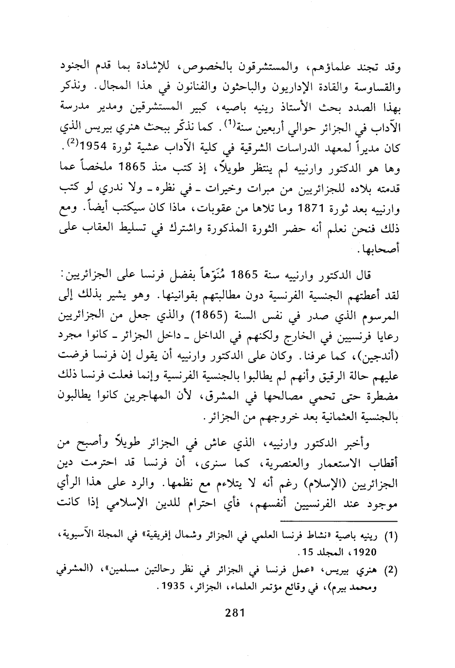وقد تجند علماؤهم، والمستشرقون بالخصوص، للإشادة بما قدم الجنود والقساوسة والقادة الإداريون والباحثون والفنانون في هذا المجال. ونذكر بهذا الصدد بحث الأستاذ رينيه باصيه، كبير المستشرقين ومدير مدرسة الآداب في الجزائر حوالي أربعين سنة (¬1). كما نذكر ببحث هنري بيريس الذي كان مديرا، لمعهد الدراسات الشرقية في كلية الآداب عشية ثورة 1954 (¬2). وها هو الدكتور وارنييه لم ينتظر طويلا، إذ كتب منذ 1865 ملخصا. عما قدمته بلاده للجزائريين من مبرات وخيرات - في نظره - ولا ندري لو كتب وارنييه بعد ثورة 1871 وما تلاها من عقوبات، ماذا كان سيكتب أيضا. ومع ذلك فنحن نعلم أنه حضر الثورة المذكورة واشترك في تسليط العقاب على أصحابها.