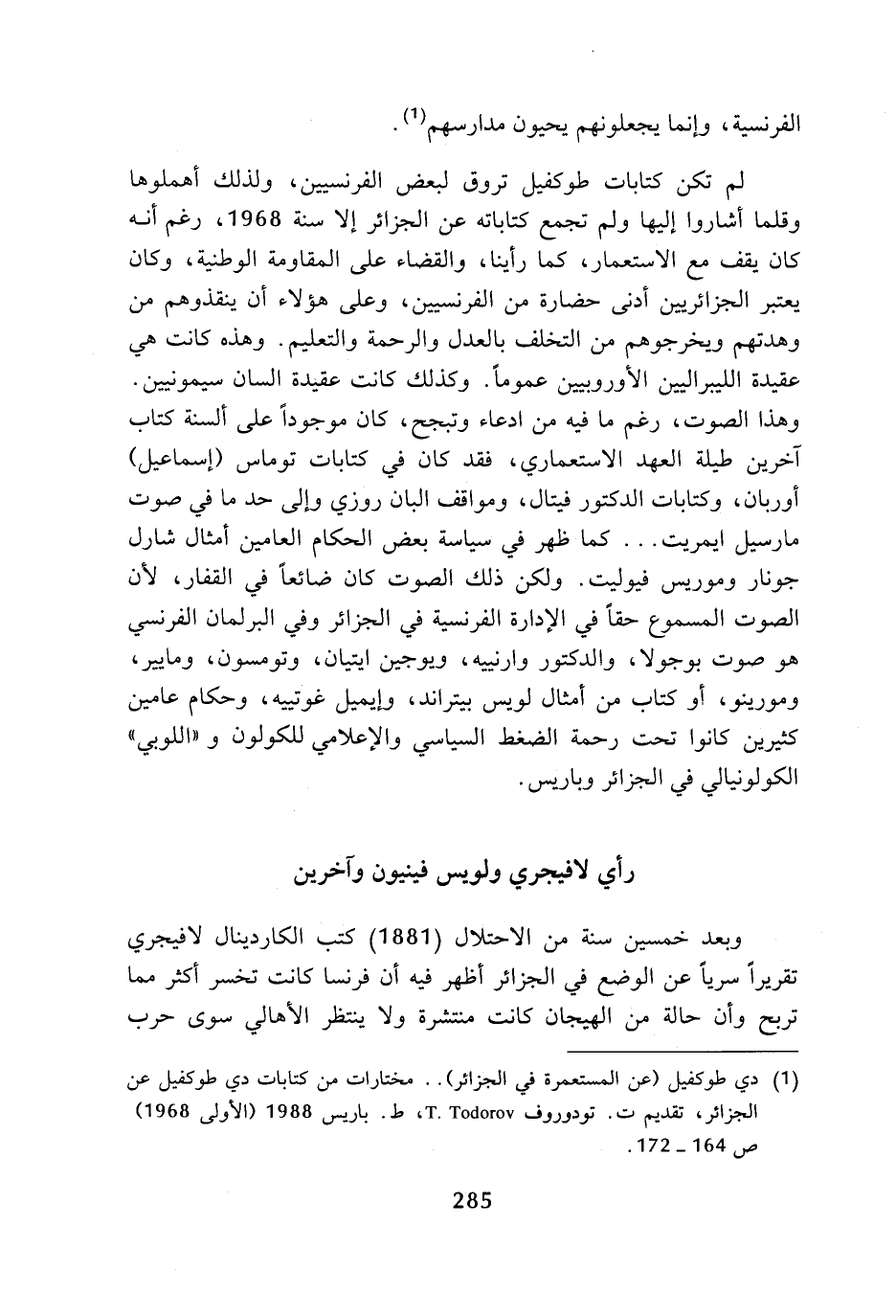 (¬1) دي طوكفيل (عن المستعمرة في الجزائر) .. مختارات من كتابات دي طوكفيل عن الجزائر، تقديم ت. تودوروف T. Todorov، ط. باريس 1988 (الأولى 1968) ص 164 - 172.