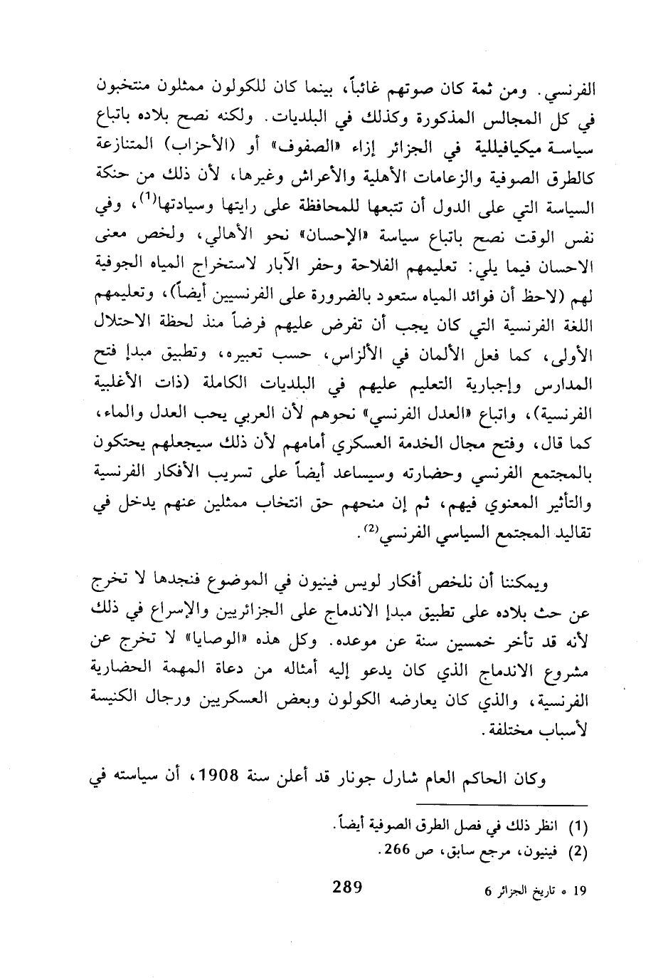 الفرنسي. ومن ثمة كان صوتهم غائبا، بينما كان للكولون ممثلون منتخبون في كل المجالس المذكورة وكذلك في البلديات. ولكنه نصح بلاده باتباع سياسة ميكيافيللية في الجزائر إزاء (الصفوف) أو (الأحزاب) المتنازعة كالطرق الصوفية والزعامات الأهلية والأعراش وغيرها، لأن ذلك من حنكة السياسة التي على الدول أن تتبعها للمحافظة على رايتها وسيادتها (¬1)، وفي نفس الوقت نصح باتباع سياسة (الإحسان) نحو الأهالي، ولخص معنى الاحسان فيما يلي: تعليمهم الفلاحة وحفر الآبار لاستخراج المياه الجوفية لهم (لاحظ أن فوائد المياه ستعود بالضرورة على الفرنسيين أيضا)، وتعليمهم اللغة الفرنسية التي كان يجب أن تفرض عليهم فرضا منذ لحظة الاحتلال الأولى، كما فعل الألمان في الألزاس، حسب تعبيره، وتطبيق مبدإ فتح المدارس وإجبارية التعليم عليهم في البلديات الكاملة (ذات الأغلبية الفرنسية)، واتباع (العدل الفرنسي) نحوهم لأن العربي يحب العدل والماء، كما قال، وفتح مجال الخدمة العسكري أمامهم لأن ذلك سيجعلهم يحتكون بالمجتمع الفرنسي وحضارته وسيساعد أيضا على تسريب الأفكار الفرنسية والتأثير المعنوي فيهم، ثم إن منحهم حق انتخاب ممثلين عنهم يدخل في تقاليد المجتمع السياسي الفرنسي (¬2).