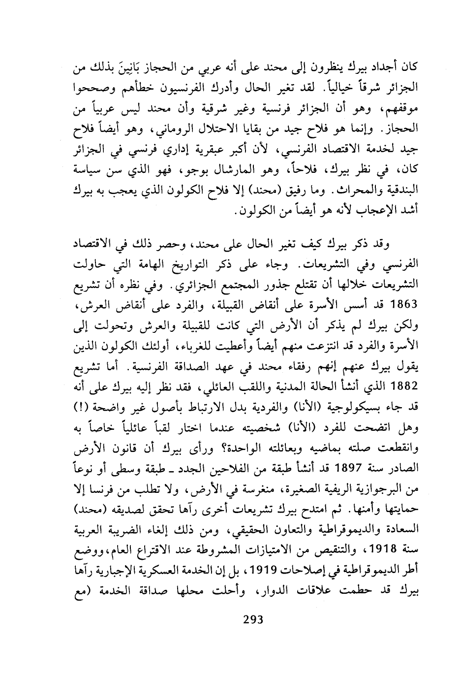 وقد ذكر بيرك كيف تغير الحال على محند، وحصر ذلك في الاقتصاد الفرنسي وفي التشريعات. وجاء على ذكر التواريخ الهامة التي حاولت التشريعات خلالها أن تقتلع جذور المجتمع الجزائري. وفي نظره أن تشريع 1863 قد أسس الأسرة على أنقاض القبيلة، والفرد على أنقاض العرش، ولكن بيرك لم يذكر أن الأرض التي كانت للقبيلة والعرش وتحولت إلى الأسرة والفرد قد انتزعت منهم أيضا وأعطيت للغرباء، أولئك الكولون الذين يقول بيرك عنهم إنهم رفقاء محند في عهد الصداقة الفرنسية. أما تشريع 1882 الذي أنشأ الحالة المدنية واللقب العائلي، فقد نظر إليه بيرك على أنه قد جاء بسيكولوجية (الأنا) والفردية بدل الارتباط بأصول غير واضحة (!) وهل اتضحت للفرد (الأنا) شخصيته عندما اختار لقبا عائليا خاصا به وانقطعت صلته بماضيه وبعائلته الواحدة؟ ورأى بيرك أن قانون الأرض الصادر سنة 1897 قد أنشأ طبقة من الفلاحين الجدد - طبقة وسطى أو نوعا من البرجوازية الريفية الصغيرة، منغرسة في الأرض، ولا تطلب من فرنسا إلا حمايتها وأمنها. ثم امتدح بيرك تشريعات أخرى رآها تحقق لصديقه (محند) السعادة والديموقراطية والتعاون الحقيقي، ومن ذلك إلغاء الضريبة العربية سنة 1918، والتنقيص من الامتيازات المشروطة عند الاقتراع العام، ووضع أطر الديموقراطية في إصلاحات 1919، بل إن الخدمة العسكرية الإجبارية رآها بيرك قد حطمت علاقات الدوار، وأحلت محلها صداقة الخدمة (مع