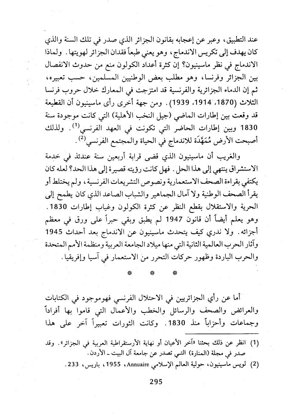 عند التطبيق، وعبر عن إعجابه بقانون الجزائر الذي صدر في تلك السنة والذي كان يهدف إلى تكريس الاندماج، وهو يعني طبعا فقدان الجزائر لهويتها. ولماذا الاندماج في نظر ماسينيون؟ إن كثرة أعداد الكولون منع من حدوث الانفصال بين الجزائر وفرنسا، وهو مطلب بعض الوطنيين المسلمين، حسب تعبيره، ثم إن الدماء الجزائرية والفرنسية قد امتزجت في المعارك خلال حروب فرنسا الثلاث (1870، 1914، 1939). ومن جهة أخرى رأى ماسينيون أن القطيعة قد وقعت بين إطارات الماضي (جيل النخب الأهلية) التي كانت موجودة سنة 1830 وبين إطارات الحاضر التي تكونت في العهد الفرنسي (¬1). ولذلك أصبحت الأرض ممهدة للاندماج في الحياة والمجتمع الفرنسي (¬2).