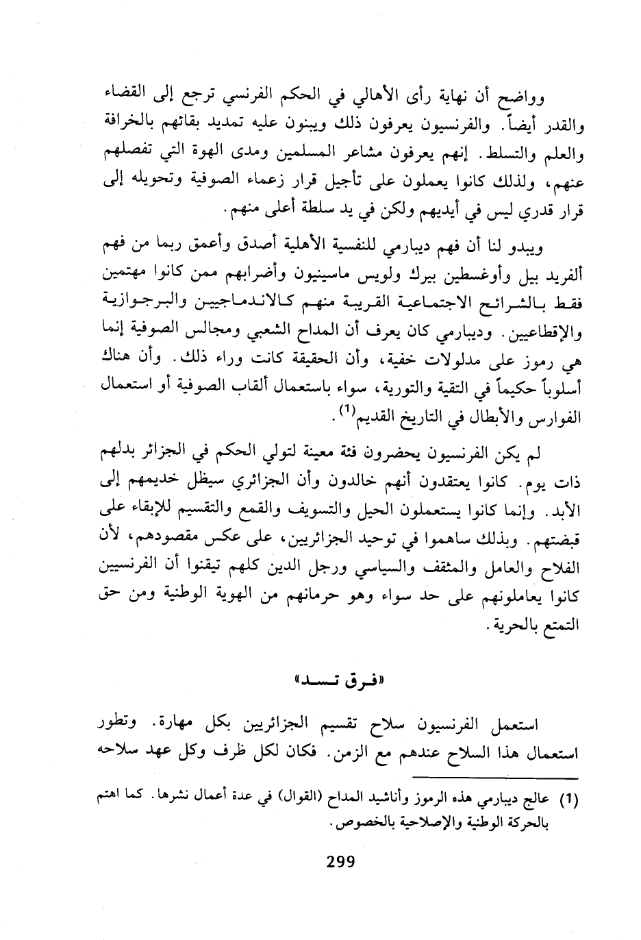 وواضح أن نهاية رأى الأهالي في الحكم الفرنسي ترجع إلى القضاء والقدر أيضا. والفرنسيون يعرفون ذلك ويبنون عليه تمديد بقائهم بالخرافة والعلم والتسلط. إنهم يعرفون مشاعر المسلمين ومدى الهوة التي تفصلهم عنهم، ولذلك كانوا يعملون على تأجيل قرار زعماء الصوفية وتحويله إلى قرار قدري ليس في أيديهم ولكن في يد سلطة أعلى منهم.