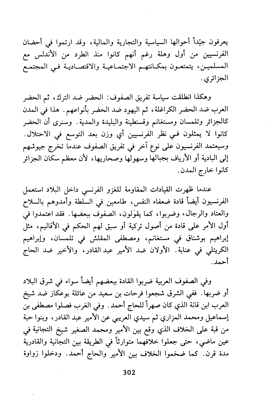 وهكذا انطلقت سياسة تفريق الصفوف: الحضر ضد الترك، ثم الحضر العرب ضد الحضر الكراغلة، ثم اليهود ضد الحضر بأنواعهم. هذا في المدن كالجزائر وتلمسان ومستغانم وقسنطينة والبليدة والمدية. وسنرى أن الحضر كانوا لا يمثلون في خطر الفرنسيين أي وزن بعد التوسع في الاحتلال. وسيعتمد الفرنسيون على نوع آخر في تفريق الصفوف عندما تخرج جيوشهم إلى البادية أو الأرياف بجبالها وسهولها وصحاريها، لأن معظم سكان الجزائر كانوا خارج المدن.