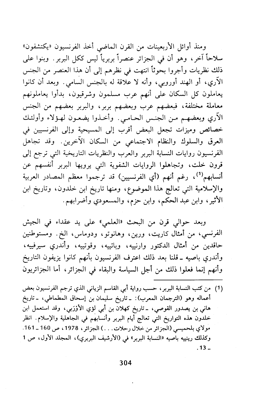 ومنذ أوائل الأربعينات من القرن الماضي أخذ الفرنسيون (يكتشفون) سلاحا آخر، وهو أن في الجزائر عنصرا بربريا ليس ككل البربر. وبنوا على ذلك نظريات وأجروا بحوثا انتهت في نظرهم إلى أن هذا العنصر من الجنس الآري، أو الهند أوروبي، وأنه لا علاقة له بالجنس السامي. وبعد أن كانوا يعاملون كل السكان على أنهم عرب مسلمون وشرقيون، بدأوا يعاملونهم معاملة مختلفة، فبعضهم عرب وبعضهم بربر، والبربر بعضهم من الجنس الآري وبعضهم من الجنس الحامي. وأخذوا يضعون لهؤلاء وأولئك خصائص وميزات تجعل البعض أقرب إلى المسيحية وإلى الفرنسيين في العرق والسلوك والنظام الاجتماعي من السكان الآخرين. وقد تجاهل الفرنسيون روايات النسابة البربر والعرب والنظريات التاريخية التي ترجع إلى قرون خلت، وتجاهلوا الروايات الشفوية التي يرويها البربر أنفسهم عن أنسابهم (¬1)، رغم أنهم (أي الفرنسيين) قد ترجموا معظم المصادر العربية والإسلامية التي تعالج هذا الموضوع، ومنها تاريخ ابن خلدون، وتاريخ ابن الأثير، وابن عبد الحكم، وابن حزم، والمسعودي وأضرابهم.