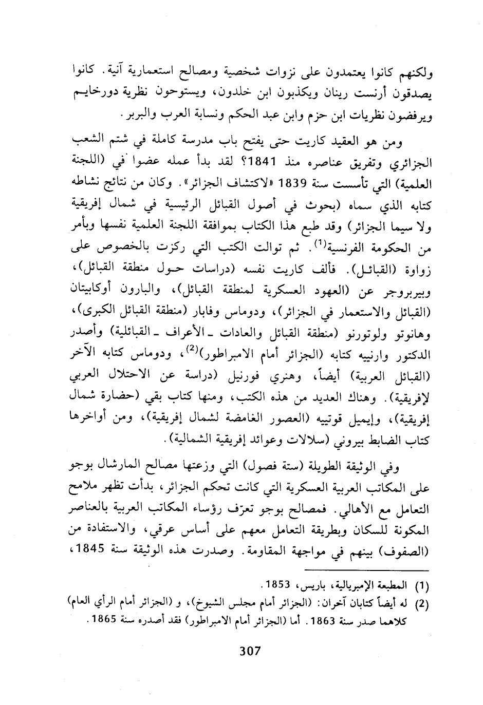 ومن هو العقيد كاريت حتى يفتح باب مدرسة كاملة في شتم الشعب الجزائري وتفريق عناصره منذ 1841؟ لقد بدأ عمله عضوا في (اللجنة العلمية) التي تأسست سنة 1839 (لاكتشاف الجزائر). وكان من نتائج نشاطه كتابه الذي سماه (بحوث في أصول القبائل الرئيسية في شمال إفريقية ولا سيما الجزائر) وقد طبع هذا الكتاب بموافقة اللجنة العلمية نفسها وبأمر من الحكومة الفرنسية (¬1). ثم توالت الكتب التي ركزت بالخصوص على زواوة (القبائل). فألف كاريت نفسه (دراسات حول منطقة القبائل)، وبيربروجر عن (العهود العسكرية لمنطقة القبائل)، والبارون أوكابيتان (القبائل والاستعمار في الجزائر)، ودوماس وفابار (منطقة القبائل الكبرى)، وهانوتو ولوتورنو (منطقة القبائل والعادات - الأعراف - القبائلية) وأصدر الدكتور وارنييه كتابه (الجزائر أمام الامبراطور) (¬2)، ودوماس كتابه الآخر (القبائل العربية) أيضا، وهنري فورنيل (دراسة عن الاحتلال العربي لإفريقية). وهناك العديد من هذه الكتب، ومنها كتاب بقي (حضارة شمال إفريقية)، وإيميل قوتييه (العصور الغامضة لشمال إفريقية)، ومن أواخرها كتاب الضابط بيروني (سلالات وعوائد إفريقية الشمالية).