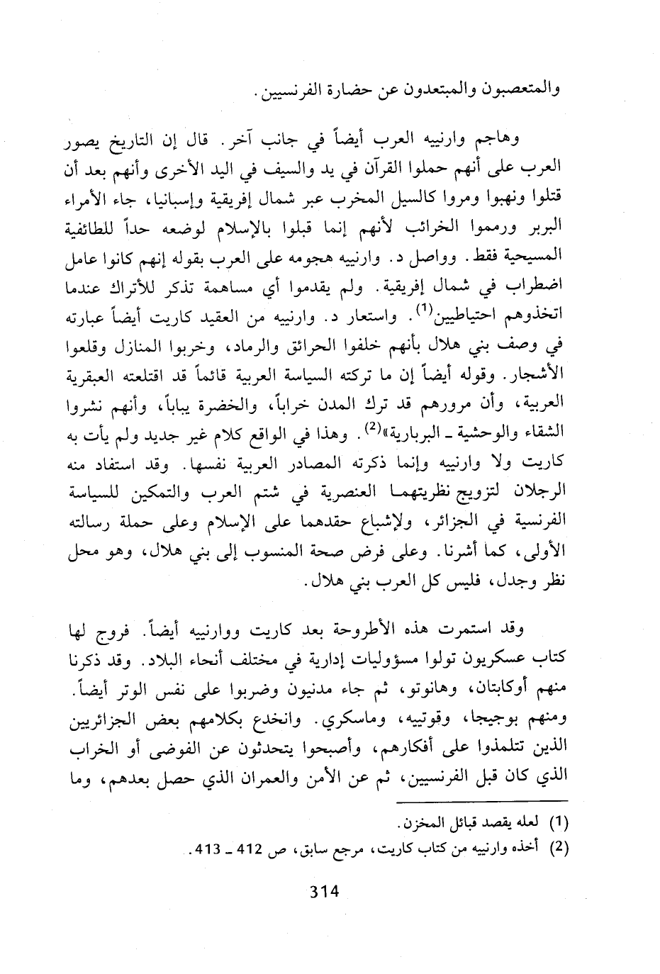 وهاجم وارنييه العرب أيضا في جانب آخر. قال إن التاريخ يصور العرب على أنهم حملوا القرآن في يد والسيف في اليد الأخرى وأنهم بعد أن قتلوا ونهبوا ومروا كالسيل المخرب عبر شمال إفريقية وإسبانيا، جاء الأمراء البربر ورمموا الخرائب لأنهم إنما قبلوا بالإسلام لوضعه حدا للطائفية المسيحية فقط. وواصل د. وارنييه هجومه على العرب بقوله إنهم كانوا عامل اضطراب في شمال إفريقية. ولم يقدموا أي مساهمة تذكر للأتراك عندما اتخذوهم احتياطيين (¬1). واستعار د. وارنييه من العقيد كاريت أيضا عبارته في وصف بني هلال بأنهم خلفوا الحرائق والرماد، وخربوا المنازل وقلعوا الأشجار. وقوله أيضا إن ما تركته السياسة العربة قائا قد اقتلعته العبقرية العربية، وأن مرورهم قد ترك المدن خرابا، والخضرة يبابا، وأنهم نشروا الشقاء والوحشية - البربارية) (¬2). وهذا في الواقع كلام غير جدول ولم يأت به كاريت ولا وارنيه وإنما ذكرته المصادر العربية نفسها. وقد استفاد منه الرجلان لتزويج نظريتهما العنصرية في شتم العرب والتمكين للسياسة الفرنسية في الجزائر، ولإشباع حقدهما على الإسلام وعلى حملة رسالته الأولى، كما أشرنا. وعلى فرض صحة المنسوب إلى بني هلال، وهو محل نظر وجدل، فليس كل العرب بني هلال.