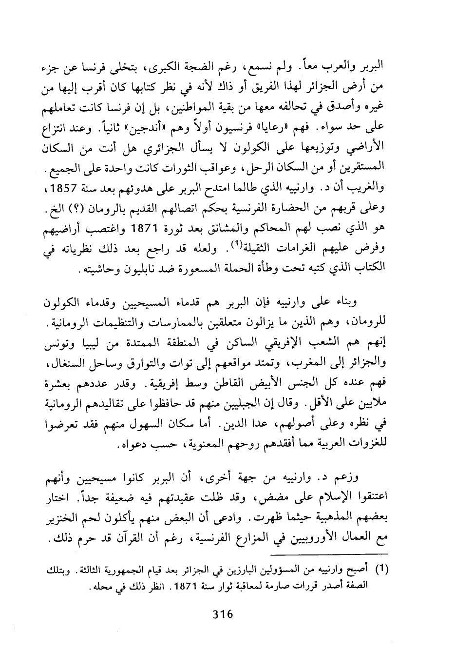 البربر والعرب معا. ولم نسمع، رغم الضجة الكبرى، بتخلي فرنسا عن جزء من أرض الجزائر لهذا الفريق أو ذاك لأنه في نظر كتابها كان أقرب إليها من غيره وأصدق في تحالفه معها من بقية المواطنين، بل إن فرنسا كانت تعاملهم على حد سواء. فهم (رعايا) فرنسيون أولا وهم (أندجين) ثانيا. وعند انتزاع الأراضي وتوزيعها على الكولون لا يسأل الجزائري هل أنت من السكان المستقرين أو من السكان الرحل، وعواقب الثورات كانت واحدة على الجميع. والغريب أن د. وارنيه الذي طالما امتدح البربر على هدوئهم بعد سنة 1857، وعلى قربهم من الحضارة الفرنسية بحكم اتصالهم القديم بالرومان (؟) الخ. هو الذي نصب لهم المحاكم والمشانق بعد ثورة 1871 واغتصب أراضيهم وفرض عليهم الغرامات الثقيلة (¬1). ولعله قد راجع بعد ذلك نظرياته في الكتاب الذي كتبه تحت وطأة الحملة المسعورة ضد نابليون وحاشيته.