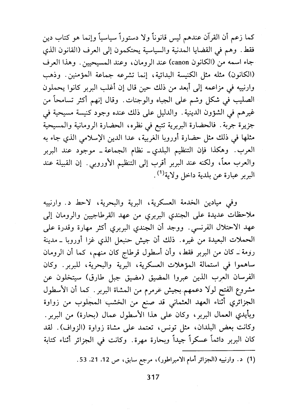 كما زعم أن القرآن عندهم ليس قانونا ولا دستورا سياسيا وإنما هو كتاب دين فقط. وهم في القضايا المدنية والسياسية يحتكمون إلى العرف (القانون الذي جاء اسمه من (الكانون canon) عند الرومان، وعند المسيحيين. وهذا العرف (الكانون) مثله مثل الكنيسة البدائية، إنما تشرعه جماعة المؤمنين. وذهب وارنييه في مزاعمه إلى أبعد من ذلك حين قال إن أغلب البربر كانوا يحملون الصليب في شكل وشم على الجباه والوجنات. وقال إنهم أكثر تسامحا من غيرهم في الشؤون الدينية. والدليل على ذلك عنده وجود كنيسة مسيحية في جزيرة جربة. فالحضارة البربرية تتبع في نظره، الحضارة الرومانية والمسيحية مثلها في ذلك مثل حضارة أوروبا الغربية، عدا الدين الإسلامي الذي جاء به العرب. وهكذا فإن التنظيم البلدي - نظام الجماعة - موجود عند البربر والعرب معا، ولكنه عند البربر أقرب إلى التنظيم الأوروبي. إن القبيلة عند البربر عبارة عن بلدية داخل ولاية (¬1).