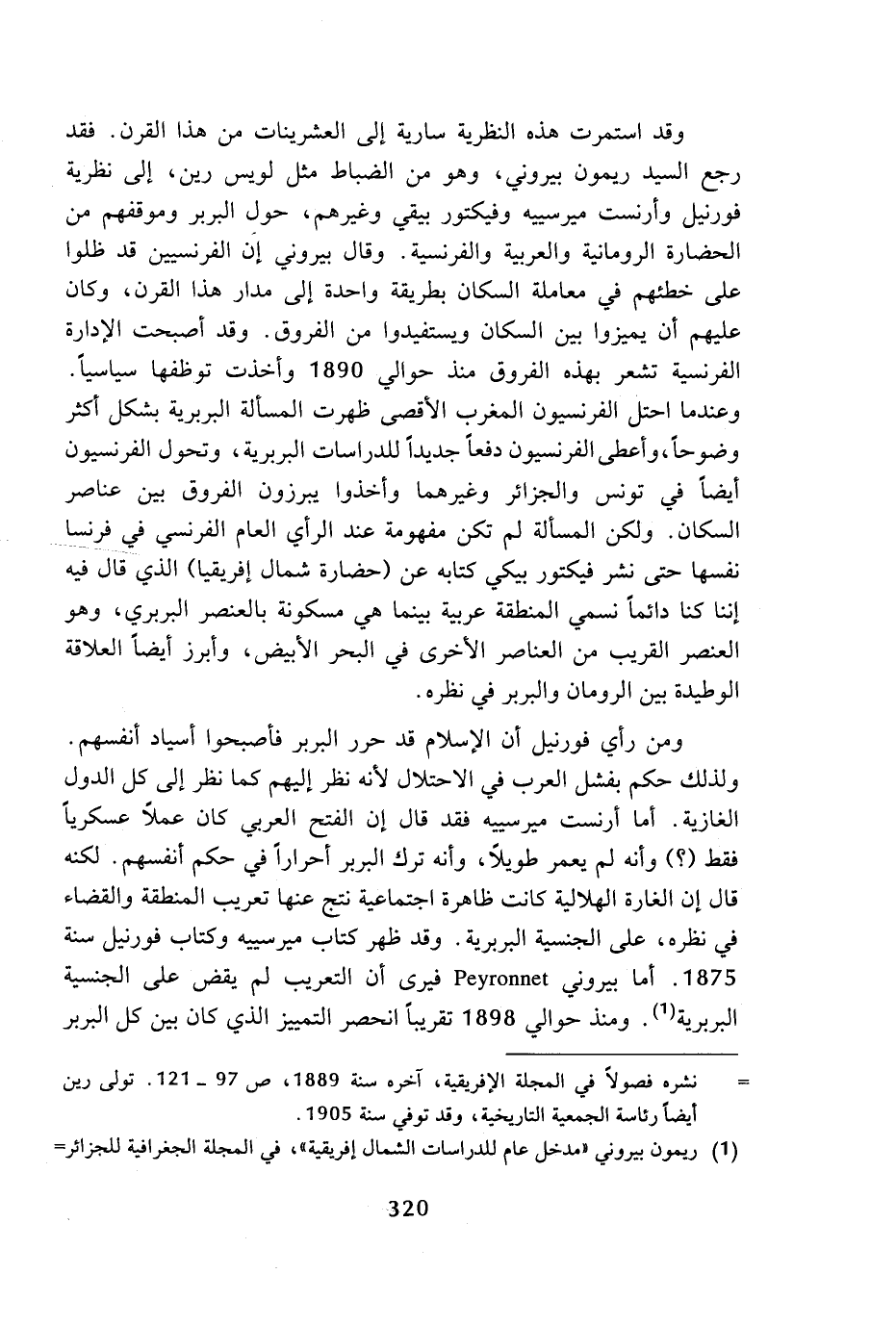 ومن رأي فورنيل أن الإسلام قد حرر البربر فأصبحوا أسياد أنفسهم. ولذلك حكم بفشل العرب في الاحتلال لأنه نظر إليهم كما نظر إلى كل الدول الغازية. أما أرنست ميرسييه فقد قال إن الفتح العربي كان عملا عسكريا فقط (؟) وأنه لم يعمر طويلا، وأنه ترك البربر أحرارا في حكم أنفسهم. لكنه قال إن الغارة الهلالية كانت ظاهرة اجتماعية نتج عنها تعريب المنطقة والقضاء في نظره، على الجنسية البربرية. وقد ظهر كتاب ميرسييه وكتاب فورنيل سنة 1875. أما بيروني Peyronnet فيرى أن التعريب لم يقض على الجنسية البربرية (¬1). ومنذ حوالي 1898 تقريبا انحصر التمييز الذي كان بين كل البربر