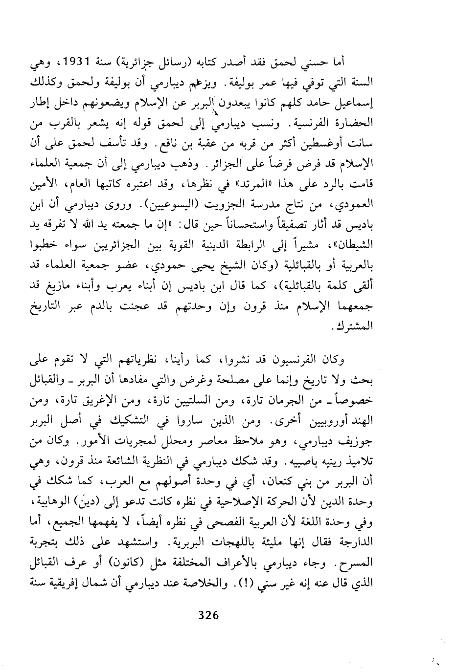 أما حسني لحمق فقد أصدر كتابه (رسائل جزائرية) سنة 1931، وهي السنة التي توفي فيها عمر بوليفة. ويزعهم ديبارمي أن بوليفة ولحمق وكذلك إسماعيل حامد كلهم كانوا يبعدون البربر عن الإسلام ويضعونهم داخل إطار الحضارة الفرنسية. ونسب ديبارمي إلى لحمق قوله إنه يشعر بالقرب من سانت أوغسطين أكثر من قرب من عقبة بن نافع. وقد تأسف لحمق على أن الإسلام قد فرض فرضا على الجزائر. وذهب ديبارمي إلى أن جمعية العلماء قامت بالرد على هذا (المرتد) في نظرها، وقد اعتبره كاتبها العام، الأمين العمودي، من نتاج مدرسة الجزويت (اليسوعيين). وروى ديبارمي أن ابن باديس قد أثار تصفيقا واستحسانا حين قال: (إن ما جمعته يد الله لا تفرقه يد الشيطان)، مشيرا إلى الرابطة الدينية القوية بين الجزائريين سواء خطبوا بالعربية أو بالقبائلية (وكان الشيخ يحيى حمودي، عضو جمعية العلماء قد ألقى كلمة بالقبائلية)، كما قال ابن باديس إن أبناء يعرب وأبناء مازيغ قد جمعهما الإسلام منذ قرون وإن وحدتهم قد عجنت بالدم عبر التاريخ المشترك.