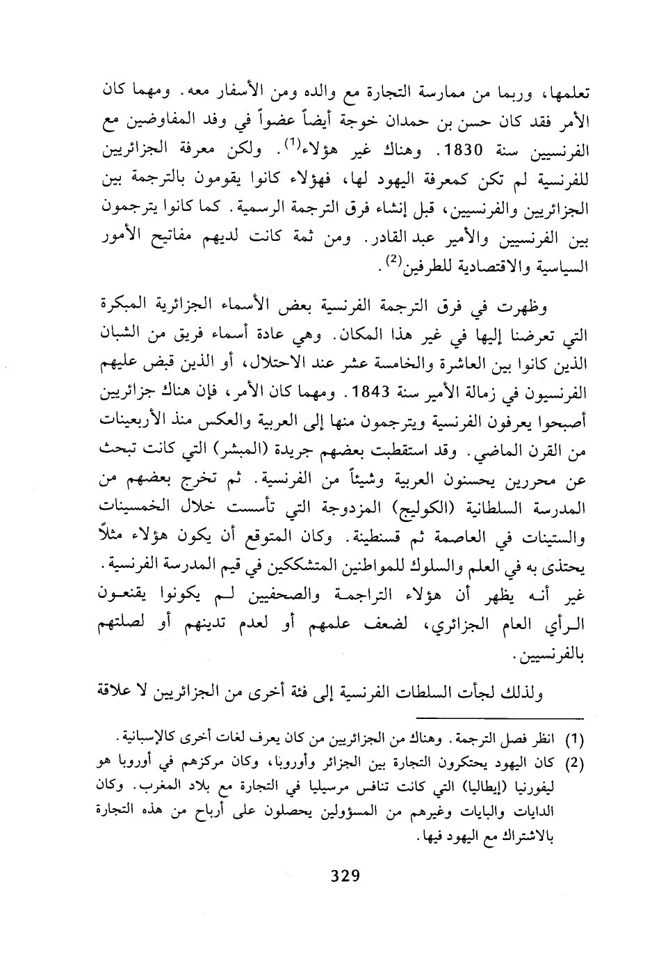 تعلمها، وربما من ممارسة التجارة مع والده ومن الأسفار معه. ومهما كان الأمر فقد كان حسن بن حمدان خوجة أيضا عضوا في وفد المفاوضين مع الفرنسيين سنة 1830. وهناك غير هؤلاء (¬1). ولكن معرفة الجزائريين للفرنسية لم تكن كمعرفة اليهود لها، فهؤلاء كانوا يقومون بالترجمة بين الجزائريين والفرنسيين، قبل إنشاء فرق الترجمة الرسمية. كما كانوا يترجمون بين الفرنسيين والأمير عبد القادر. ومن ثمة كانت لديهم مفاتيح الأمور السياسية والاقتصادية للطرفين (¬2).