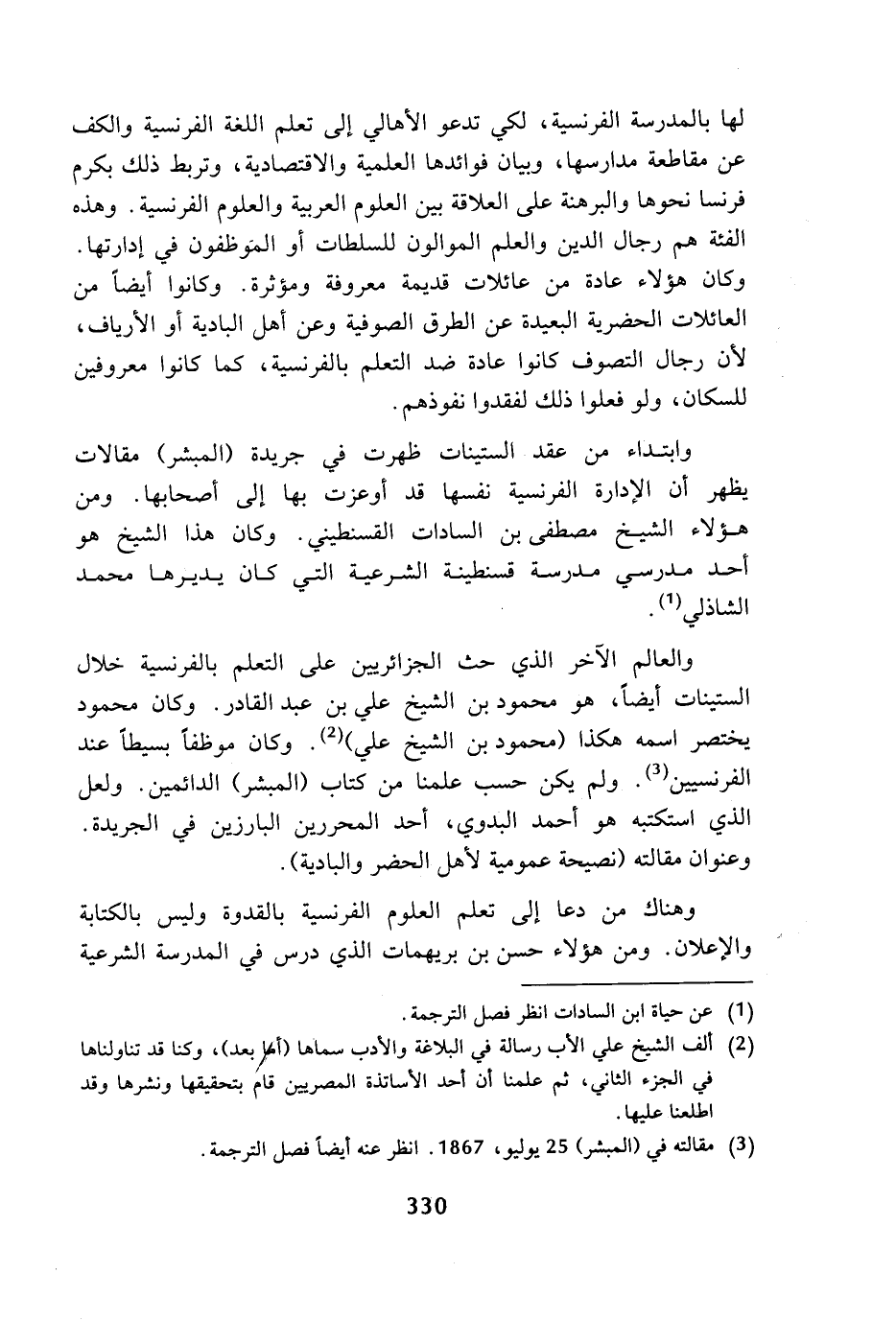 لها بالمدرسة الفرنسية، لكي تدعو الأهالي إلى تعلم اللغة الفرنسية والكف عن مقاطعة مدارسها، وبيان فوائدها العلمية والاقتصادية، وتربط ذلك بكرم فرنسا نحوها والبرهنة على العلاقة بين العلوم العربية والعلوم الفرنسية. وهذه الفئة هم رجال الدين والعلم الموالون للسلطات أو الموظفون في إدارتها. وكان هؤلاء عادة من عائلات قديمة معروفة ومؤثرة. وكانوا أيضا من العائلات الحضرية البعيدة عن الطرق الصوفية وعن أهل البادية أو الأرياف، لأن رجال التصوف كانوا عادة ضد التعلم بالفرنسية، كما كانوا معروفين للسكان، ولو فعلوا ذلك لفقدوا نفوذهم.