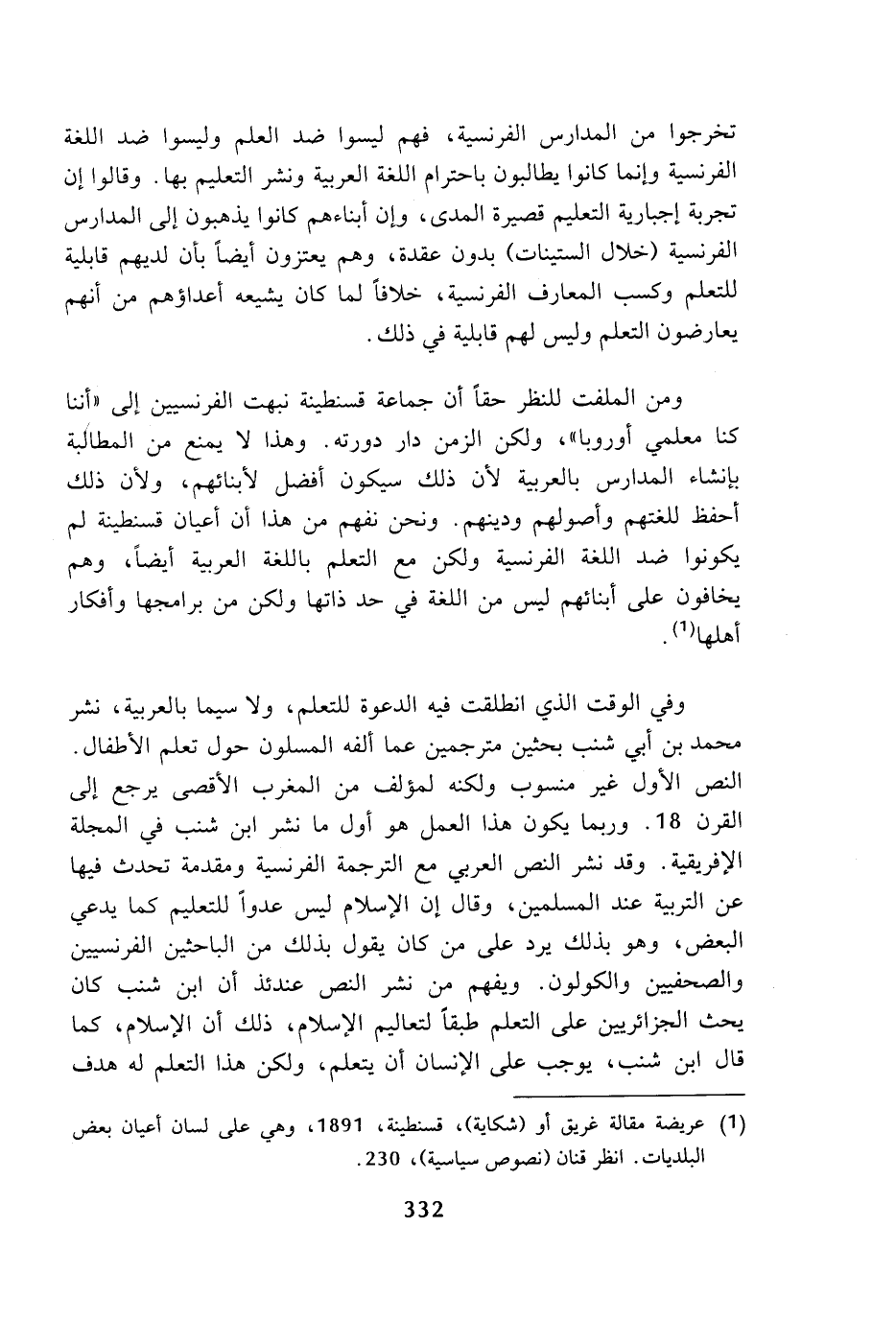 ومن الملفت للنظر حقا، أن جماعة قسنطينة نبهت الفرنسيين إلى (أننا كنا معلمي أوروبا)، ولكن الزمن دار دورته. وهذا لا يمنع من المطالبة بإنشاء المدارس بالعربية لأن ذلك سيكون أفضل لأبنائهم، ولأن ذلك أحفظ للغتهم وأصولهم ودينهم. ونحن نفهم من هذا أن أعيان قسنطينة لم يكونوا ضد اللغة الفرنسية ولكن مع التعلم باللغة العربية أيضا، وهم يخافون على أبنائهم ليس من اللغة في حد ذاتها ولكن من برامجها وأفكار أهلها (¬1).