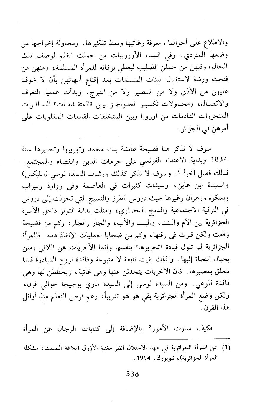 (¬1) عن المرأة الجزائرية في عهد الاحتلال انظر مغنية الأزرق (بلاغة الصمت: مشكلة المرأة الجزائرية)، نيويورك، 1994.