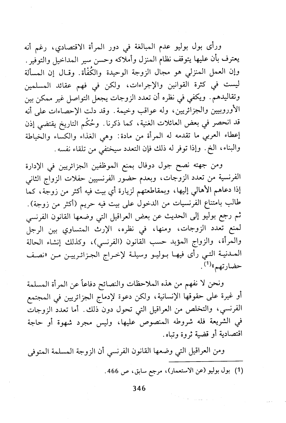 ونحن لا نفهم من هذه الملاحظات والنصائح دفاعا عن المرأة المسلمة أو غيرة على حقوقها الإنسانية، ولكن دعوة لإدماج الجزائريين في المجتمع الفرنسي، والتخلص من العراقيل التي تحول دون ذلك. أما تعدد الزوجات في الشريعة فله شروطه المنصوص عليها، وليس مجرد شهوة أو حاجة اقتصادية أو قضية ثروة وتباه.