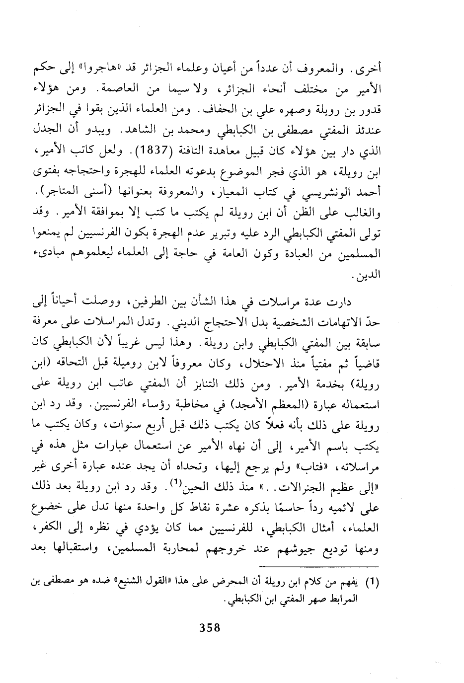أخرى. والمعروف أن عددا، من أعيان وعلماء الجزائر قد (هاجروا) إلى حكم الأمير من مختلف أنحاء الجزائر، ولاسيما من العاصمة. ومن هؤلاء قدور بن رويلة وصهره علي بن الحفاف. ومن العلماء الذين بقوا في الجزائر عندئذ المفتي مصطفى بن الكبابطي ومحمد بن الشاهد. ويبدو أن الجدل الذي دار بين هؤلاء كان قبيل معاهدة التافنة (1837). ولعل كاتب الأمير، ابن رويلة، هو الذي فجر الموضوع بدعوى العلماء للهجرة واحتجاجه بفتوى أحمد الونشريسي في كتاب المعيار، والمعروفة بعنوانها (أسنى المتاجر). والغالب على الظن أن ابن رويلة لم يكتب ما كتب إلا بموافقة الأمير. وقد تولى المفتي الكبابطي الرد عليه وتبرير عدم الهجرة بكون الفرنسيين لم يمنعوا المسلمين من العبادة وكون العامة في حاجة إلى العلماء ليعلموهم مبادئ الدين.