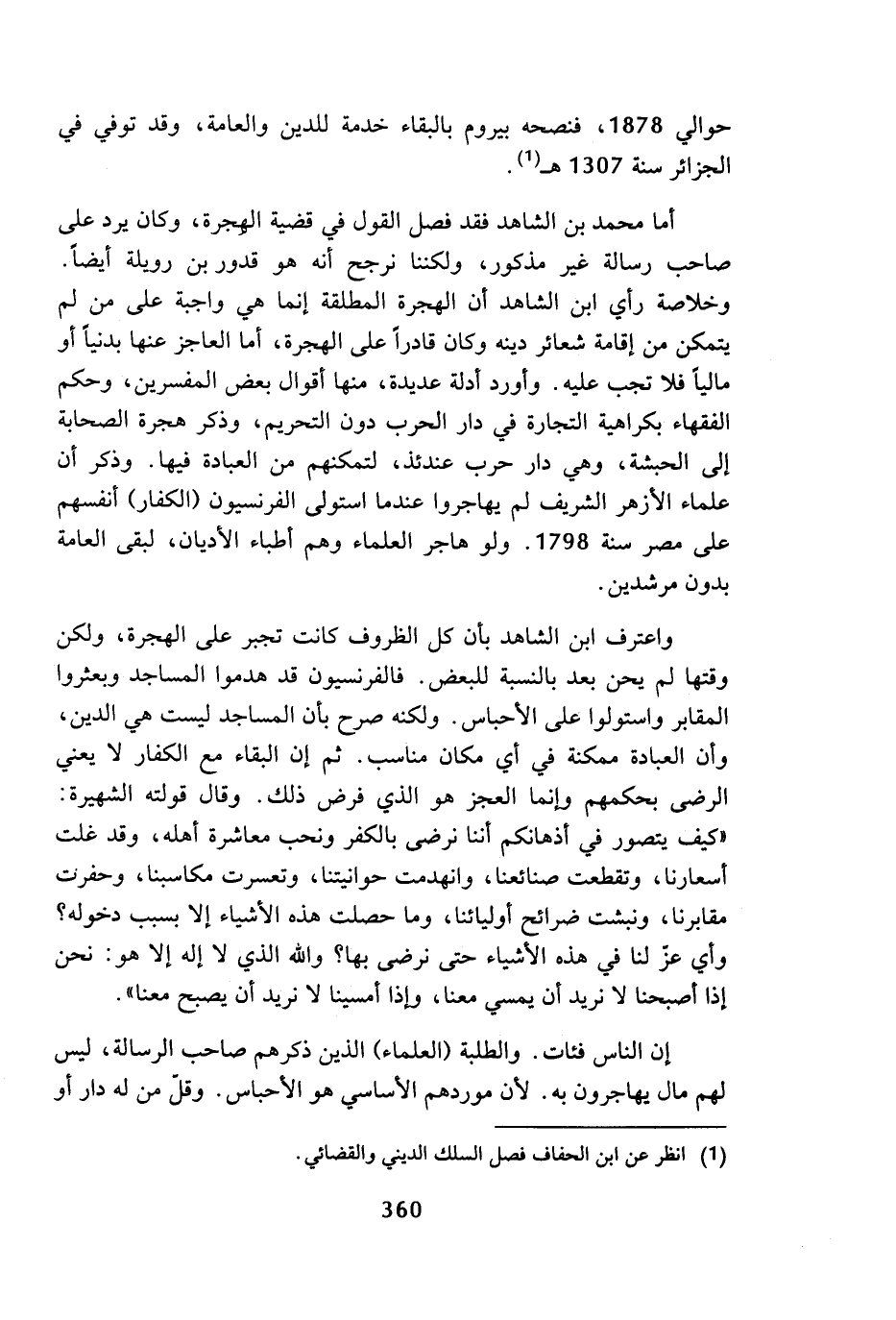 واعترف ابن الشاهد بأن كل الظروف كانت تجبر على الهجرة، ولكن وقتها لم يحن بعد بالنسبة للبعض. فالفرنسيون قد هدموا المساجد وبعثروا المقابر واستولوا على الأحباس. ولكنه صرح بأن المساجد ليست هي الدين، وأن العبادة ممكنة في أي مكان مناسب. ثم إن البقاء مع الكفار لا يعني الرضى بحكمهم وإنما العجز هو الذي فرض ذلك. وقال قولته الشهيرة: (كيف يتصور في أذهانكم أننا نرضى بالكفر ونحب معاشرة أهله، وقد غلت أسعارنا، وتقطعت صنائعنا، وانهدمت حوانيتنا، وتعسرت مكاسبنا، وحفرت مقابرنا، ونبشت ضرائح أوليائنا، وما حصلت هذه الأشياء إلا بسبب دخوله؟ وأي عز لنا في هذه الأشياء حتى نرضى بها؟ والله الذي لا إله إلا هو: نحن إذا أصبحنا لا نريد أن يمسي معنا، وإذا أمسينا لا نرد أن يصبح معنا).
