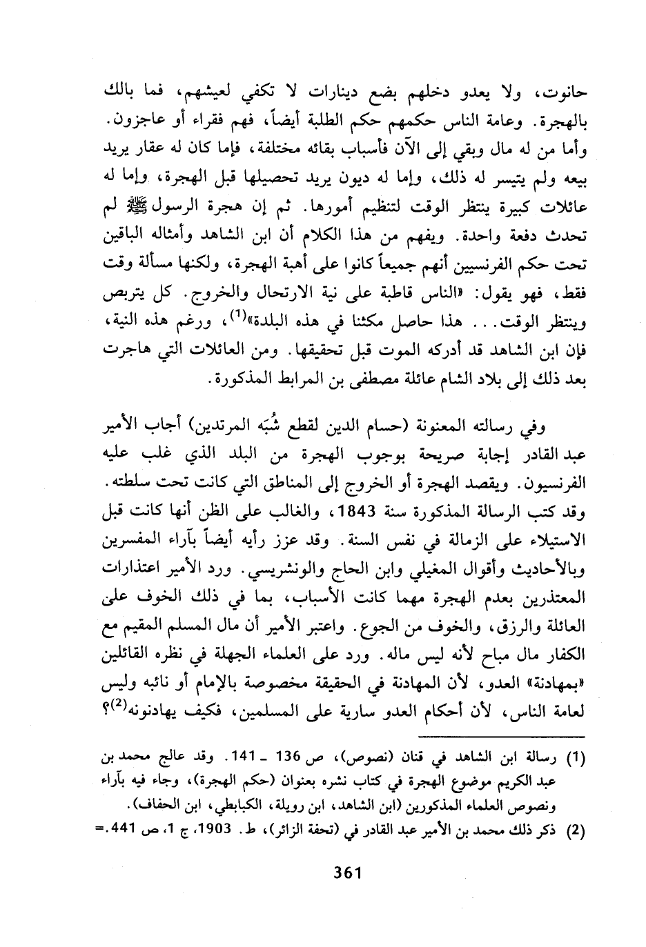 وفي رسالته المعنونة (حسام الدين لقطع شبه المرتدين) أجاب الأمير عبد القادر إجابة صريحة بوجوب الهجرة من البلد الذي غلب عليه الفرنسيون. ويقصد الهجرة أو الخروج إلى المناطق التي كانت تحت سلطته. وقد كتب الرسالة المذكورة سنة 1843، والغالب على الظن أنها كانت قبل الاستيلاء على الزمالة في نفس السنة. وقد عزز رأيه أيضا بآراء المفسرين وبالأحاديث وأقوال المغيلي وابن الحاج والونشريسي. ورد الأمير اعتذارات المعتذرين بعدم الهجرة مهما كانت الأسباب، بما في ذلك الخوف علن العائلة والرزق، والخوف من الجوع. واعتبر الأمير أن مال المسلم المقيم مع الكفار مال مباح لأنه ليس ماله. ورد على العلماء الجهلة في نظره القائلين (بمهادنة) العدو، لأن المهادنة في الحقيقة مخصوصة بالإمام أو نائبه وليس لعامة الناس، لأن أحكام العدو سارية على المسلمين، فكيف يهادنونه (¬2)؟
