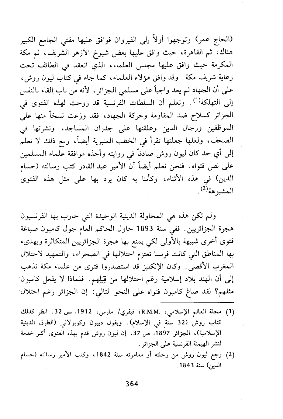 (الحاج عمر) وتوجهوا أولا إلى القيروان فوافق عليها مفتي الجامع الكبير هناك، ثم القاهرة، حيث وافق عليها بعض شيوخ الأزهر الشرف، ثم مكة المكرمة حيث وافق عليها مجلس العلماء، الذي انعقد في الطائف تحت رعاية شريف مكة. وقد وافق هؤلاء العلماء، كما جاء في كتاب ليون روش، على أن الجهاد لم يعد واجبا على مسلمي الجزائر، لأنه من باب إلقاء بالنفس إلى التهلكة (¬1). ونعلم أن السلطات الفرنسية قد روجت لهذه الفتوى في الجزائر كسلاح ضد المقاومة وحركة الجهاد، فقد وزعت نسخا منها على الموظفين ورجال الدين وعلقتها على جدران المساجد، ونشرتها في الصحف، ولعلها جعلتها تقرأ في الخطب المنبرية أيضا، ومع ذلك لا نعلم إلى أي حد كان ليون روش صادقا، في روايته وأخذه موافقة علماء المسلمين على نص فتواه. فنحن نعلم أيضا أن الأمير عبد القادر كتب رسالته (حسام الدين) في هذه الأثناء، وكأننا به كان يرد بها على مثل هذه الفتوى المشبوهة (¬2).