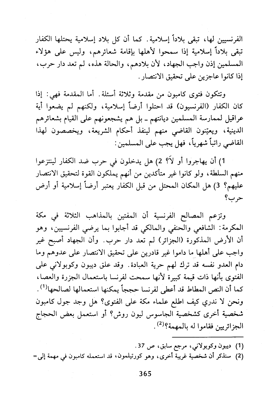 وتزعم المصالح الفرنسية أن المفتين بالمذاهب الثلاثة في مكة المكرمة: الشافعي والحنفي والمالكي قد أجابوا بما يرضي الفرنسيين، وهو أن الأرض المذكورة (الجزائر) لم تعد دار حرب. وأن الجهاد أصبح غير واجب على أهلها ما داموا غير قادرين على تحقيق الانتصار على عدوهم وما دام العدو نفسه قد ترك لهم حرية العبادة. وقد علق ديبون وكوبولاني على الفتوى بأنها ذات قيمة كبيرة لأنها سمحت لفرنسا باستعمال الجزرة والعصا، كما أن النص المطاط قد أعطى لفرنسا حججا يمكنها استعمالها لصالحها (¬1). ونحن لا ندري كيف اطلع علماء مكة على الفتوى؟ هل وجد جول كامبون شخصية أخرى كشخصية الجاسوس ليون روش؟ أو استعمل بعض الحجاج الجزائريين فقاموا له بالمهمة؟ (¬2).
