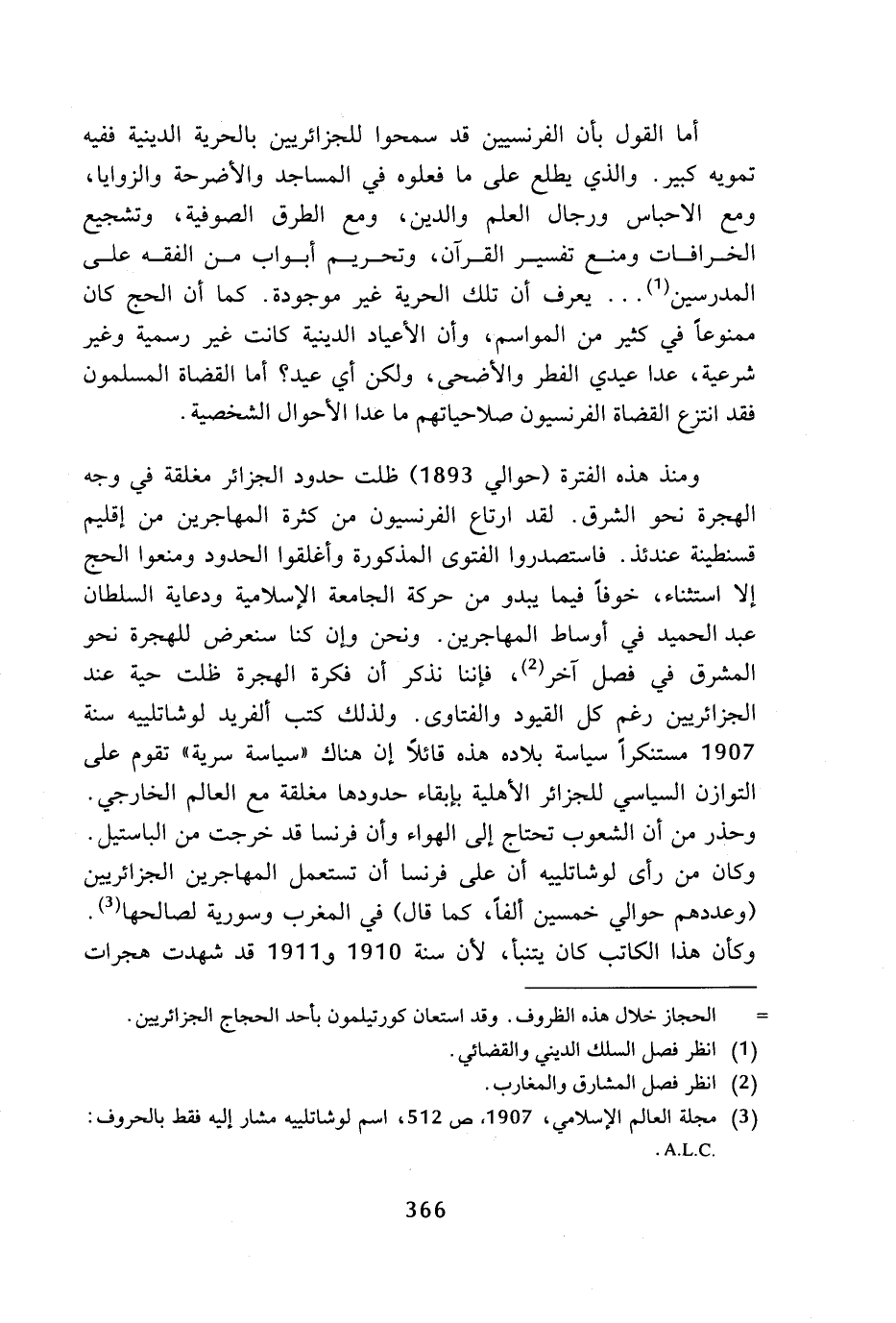 ومنذ هذه الفترة (حوالي 1893) ظلت حدود الجزائر مغلقة في وجه الهجرة نحو الشرق. لقد ارتاع الفرنسيون من كثرة المهاجرين من إقليم قسنطينة عندئذ. فاستصدروا الفتوى المذكورة وأغلقوا الحدود ومنعوا الحج إلا استثناء، خوفا فيما يبدو من حركة الجامعة الإسلامية ودعاية السلطان عبد الحميد في أوساط المهاجرين. ونحن وإن كنا سنعرض للهجرة نحو المشرق في فصل آخر (¬2)، فإننا نذكر أن فكرة الهجرة ظلت حية عند الجزائريين رغم كل القيود والفتاوى. ولذلك كتب ألفريد لوشاتلييه سنة 1907 مستنكرا سياسة بلاده هذه قائلا إن هناك (سياسة سرية) تقوم على التوازن السياسي للجزائر الأهلية بإبقاء حدودها مغلقة مع العالم الخارجي. وحذر من أن الشعوب تحتاج إلى الهواء وأن فرنسا قد خرجت من الباستيل. وكان من رأى لوشاتلييه أن على فرنسا أن تستعمل المهاجرين الجزائريين (وعددهم حوالي خمسين ألفا، كما قال) في المغرب وسورية لصالحها (¬3). وكأن هذا الكاتب كان يتنبأ، لأن سنة 1910 و 1911 قد شهدت هجرات