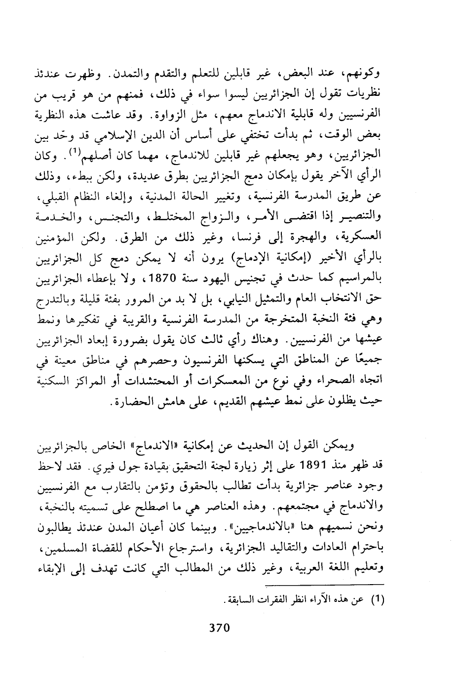 وكونهم، عند البعض، غير قابلين للتعلم والتقدم والتمدن. وظهرت عندئذ نظريات تقول إن الجزائريين ليسوا سواء في ذلك، فمنهم من هو قريب من الفرنسيين وله قابلية الاندماج معهم، مثل الزواوة. وقد عاشت هذه النظرية بعض الوقت، ثم بدأت تختفي على أساس أن الدين الإسلامي قد وحد بين الجزائريين، وهو يجعلهم غير قابلين للاندماج، مهما كان أصلهم (¬1). وكان الرأي الآخر يقول بإمكان دمج الجزائريين بطرق عديدة، ولكن ببطء، وذلك عن طريق المدرسة الفرنسية، وتغيير الحالة المدنية، وإلغاء النظام القبلي، والتنصير إذا اقتضى الأمر، والزواج المختلط، والتجنس، والخدمة العسكرية، والهجرة إلى فرنسا، وغير ذلك من الطرق. ولكن المؤمنين بالرأي الأخير (إمكانية الإدماج) يرون أنه لا يمكن دمج كل الجزائريين بالمراسيم كما حدث في تجنيس اليهود سنة 1870، ولا بإعطاء الجزائريين حق الانتخاب العام والتمثيل النيابي، بل لا بد من المرور بفئة قليلة وبالتدرج وهي فئة النخبة المتخرجة من المدرسة الفرنسية والقريبة في تفكيرها ونمط عيشها من الفرنسيين. وهناك رأي ثالث كان يقول بضرورة إبعاد الجزائريين جميعا عن المناطق التي يسكنها الفرنسيون وحصرهم في مناطق معينة في اتجاه الصحراء وفي نوع من المعسكرات أو المحتشدات أو المراكز السكنية حيث يظلون على نمط عيشهم القديم، على هامش الحضارة.