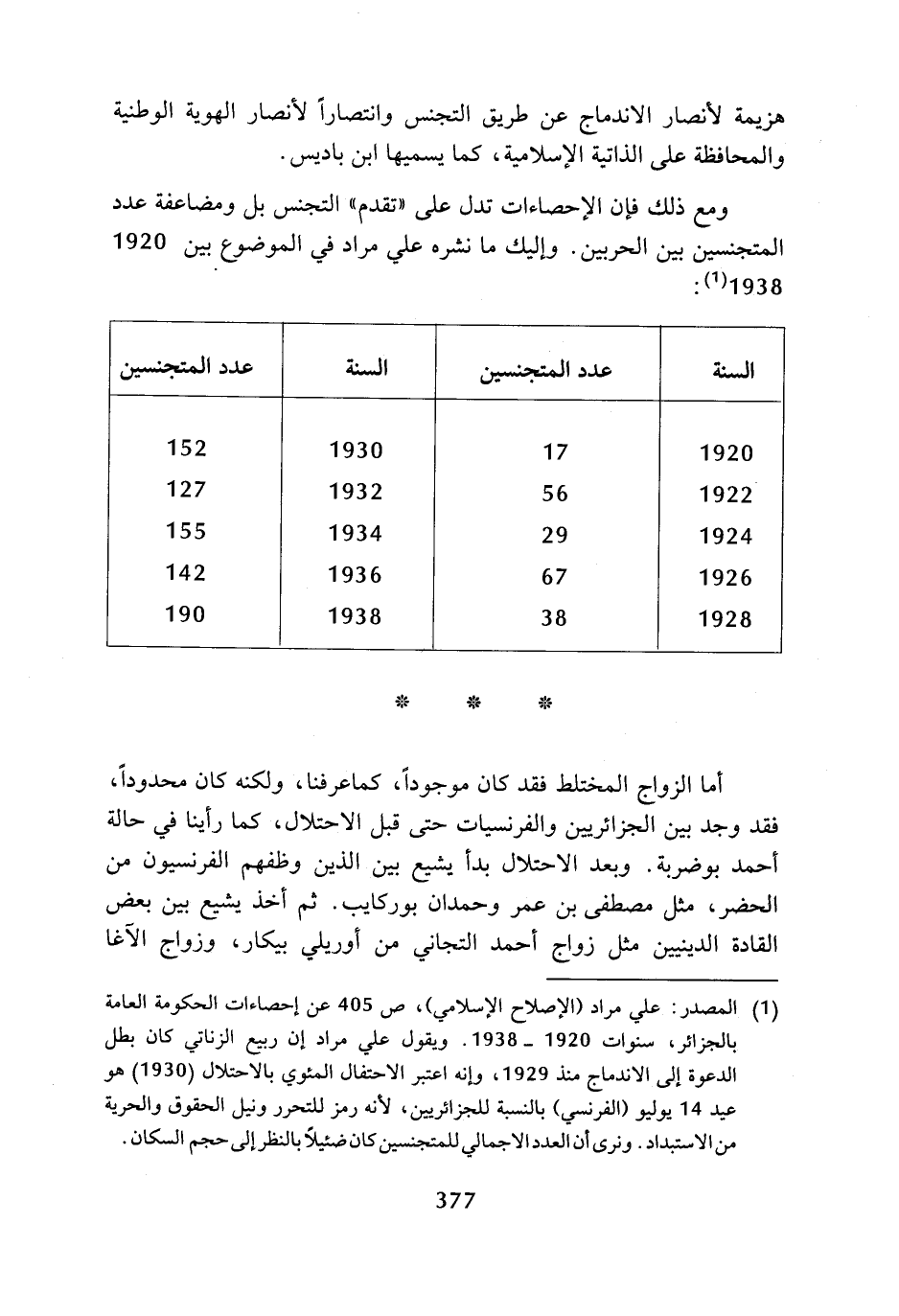 (¬1) المصدر: علي مراد (الإصلاح الإسلامي)، ص 405 عن إحصاءات الحكومة العامة بالجزائر، سنوات 1920 - 1938. ويقول علي مراد إن ربيع الزناتي كان بطل الدعوة إلى الاندماج منذ 1929، وإنه اعتبر الاحتفال المئوي بالاحتلال (1930) هو عيد 14 يوليو (الفرنسي) بالنسبة للجزائريين، لأنه رمز للتحرر ونيل الحقوق والحرية من الاستبداد. ونرى أن العدد الاجمالي للمتجنسين كان ضئيلا بالنظر إلى حجم السكان.