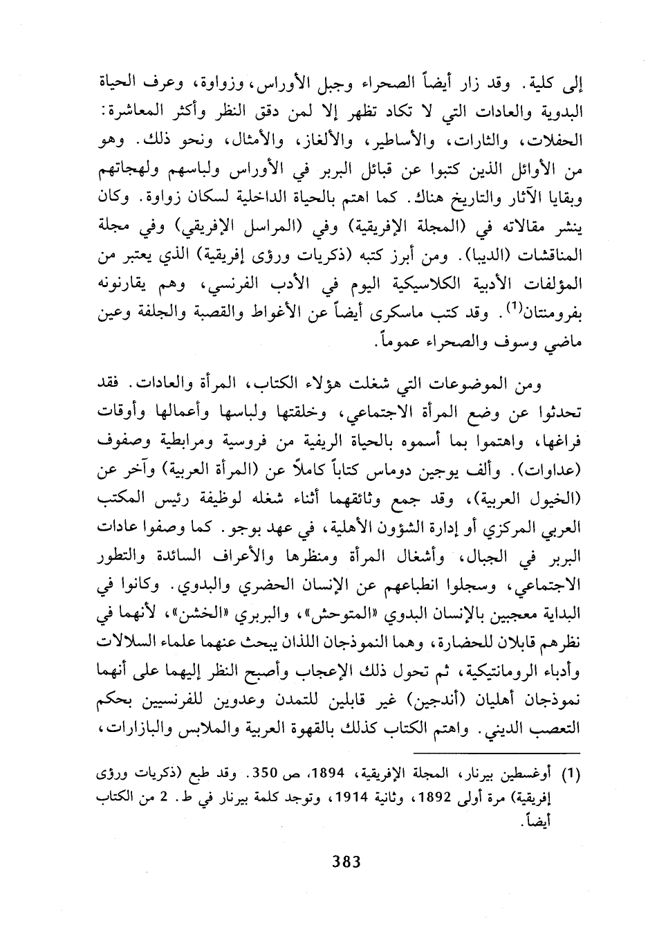 إلى كلية. وقد زار أيضا الصحراء وجبل الأوراس، وزواوة، وعرف الحياة البدوية والعادات التي لا تكاد تظهر إلا لمن دقق النظر وأكثر المعاشرة: الحفلات، والثارات، والأساطير، والألغاز، والأمثال، ونحو ذلك. وهو من الأوائل الذين كتبوا عن قبائل البربر في الأوراس ولباسهم ولهجاتهم وبقايا الآثار والتاريخ هناك. كما اهتم بالحياة الداخلية لسكان زواوة. وكان ينشر مقالاته في (المجلة الإفريقية) وفي (المراسل الإفريقي) وفي مجلة المناقشات (الديبا). ومن أبرز كتبه (ذكريات ورؤى إفريقية) الذي يعتبر من المؤلفات الأدبية الكلاسيكية اليوم في الأدب الفرنسي، وهم يقارنونه بفرومنتان (¬1). وقد كتب ماسكرى أيضا، عن الأغواط والقصبة والجلفة وعين ماضي وسوف والصحراء عموما.