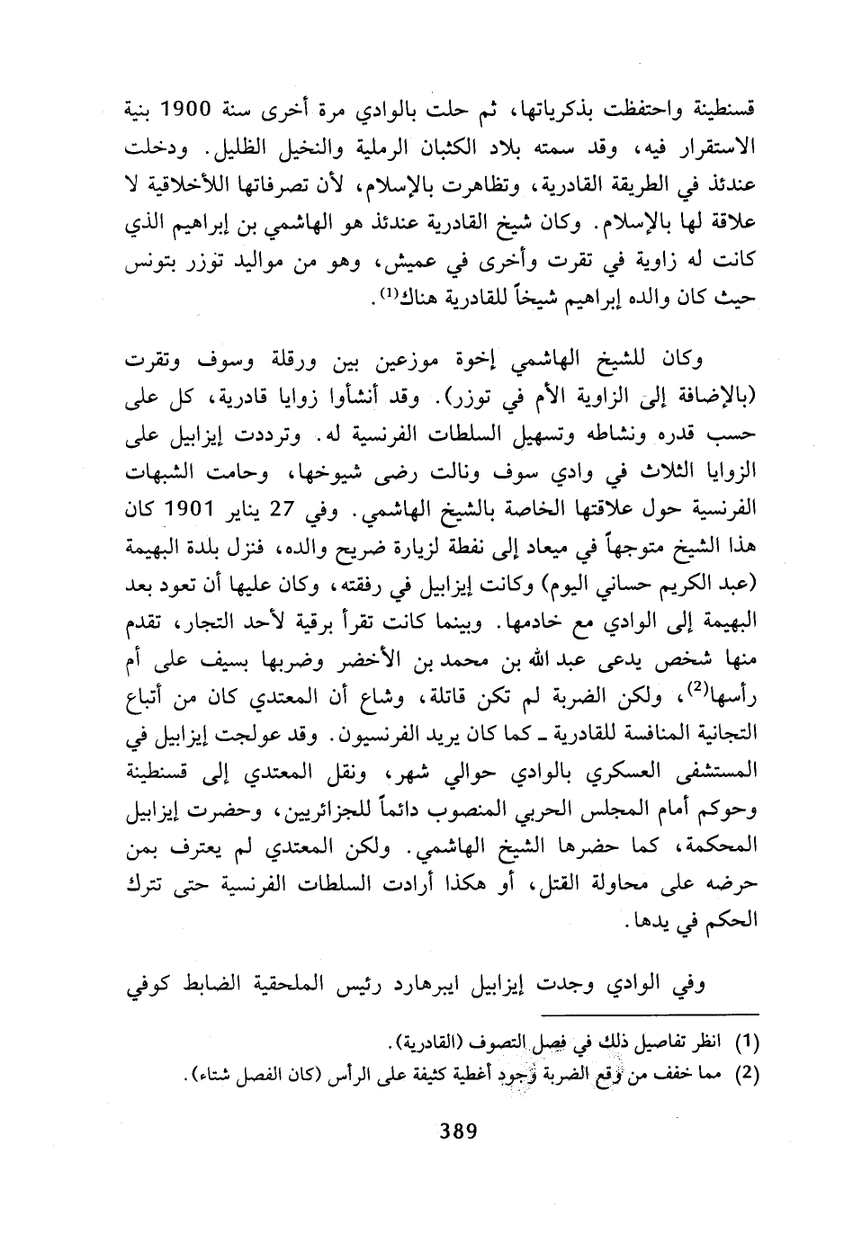 قسنطينة واحتفظت بذكرياتها، ثم حلت بالوادي مرة أخرى سنة 1900 بنية الاستقرار فيه، وقد سمته بلاد الكثبان الرملية والنخيل الظليل. ودخلت عندئذ في الطريقة القادرية، وتظاهرت بالإسلام، لأن تصرفاتها الاخلاقية لا علاقة لها بالإسلام. وكان شيخ القادرية عندئذ هو الهاشمي بن إبراهيم الذي كانت له زاوية في تقرت وأخرى في عميش، وهو من مواليد توزر بتونس حيث كان والده إبراهيم شيخا للقادرية هناك (¬1).