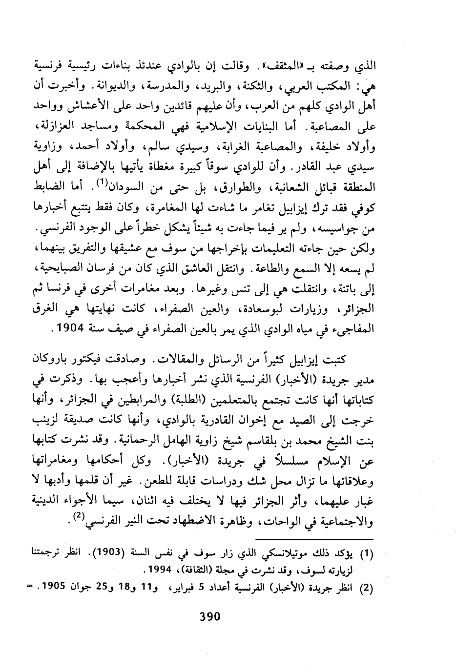 الذي وصفته بـ (المثقف). وقالت إن بالوادي عندئذ بناءات رئيسية فرنسية هي: المكتب العربي، والثكنة، والبريد، والمدرسة، والديوانة. وأخبرت أن أهل الوادي كلهم من العرب، وأن عليهم قائدين واحد على الأعشاش وواحد على المصاعبة. أما البنايات الإسلامية فهي المحكمة ومساجد العزازلة، وأولاد خليفة، والمصاعبة الغرابة، وسيدي سالم، وأولاد أحمد، وزاوية سيدي عبد القادر. وأن للوادي سوقا كبيرة مغطاة يأتيها بالإضافة إلى أهل المنطقة قبائل الشعانبة، والطوارق، بل حتى من السودان (¬1). أما الضابط كوفي فقد ترك إيزابيل تغامر ما شاءت لها المغامرة، وكان فقط يتتبع أخبارها من جواسيسه، ولم ير فيما جاءت به شيئا يشكل خطرا على الوجود الفرنسي. ولكن حين جاءته التعليمات بإخراجها من سوف مع عشيقها والتفريق بينهما، لم يسعه إلا السمع والطاعة. وانتقل العاشق الذي كان من فرسان الصبايحية، إلى باتنة، وانتقلت هي إلى تنس وغيرها. وبعد مغامرات أخرى في فرنسا ثم الجزائر، وزيارات لبوسعادة، والعين الصفراء، كانت نهايتها هي الغرق المفاجئ في مياه الوادي الذي يمر بالعين الصفراء في صيف سنة 1904.