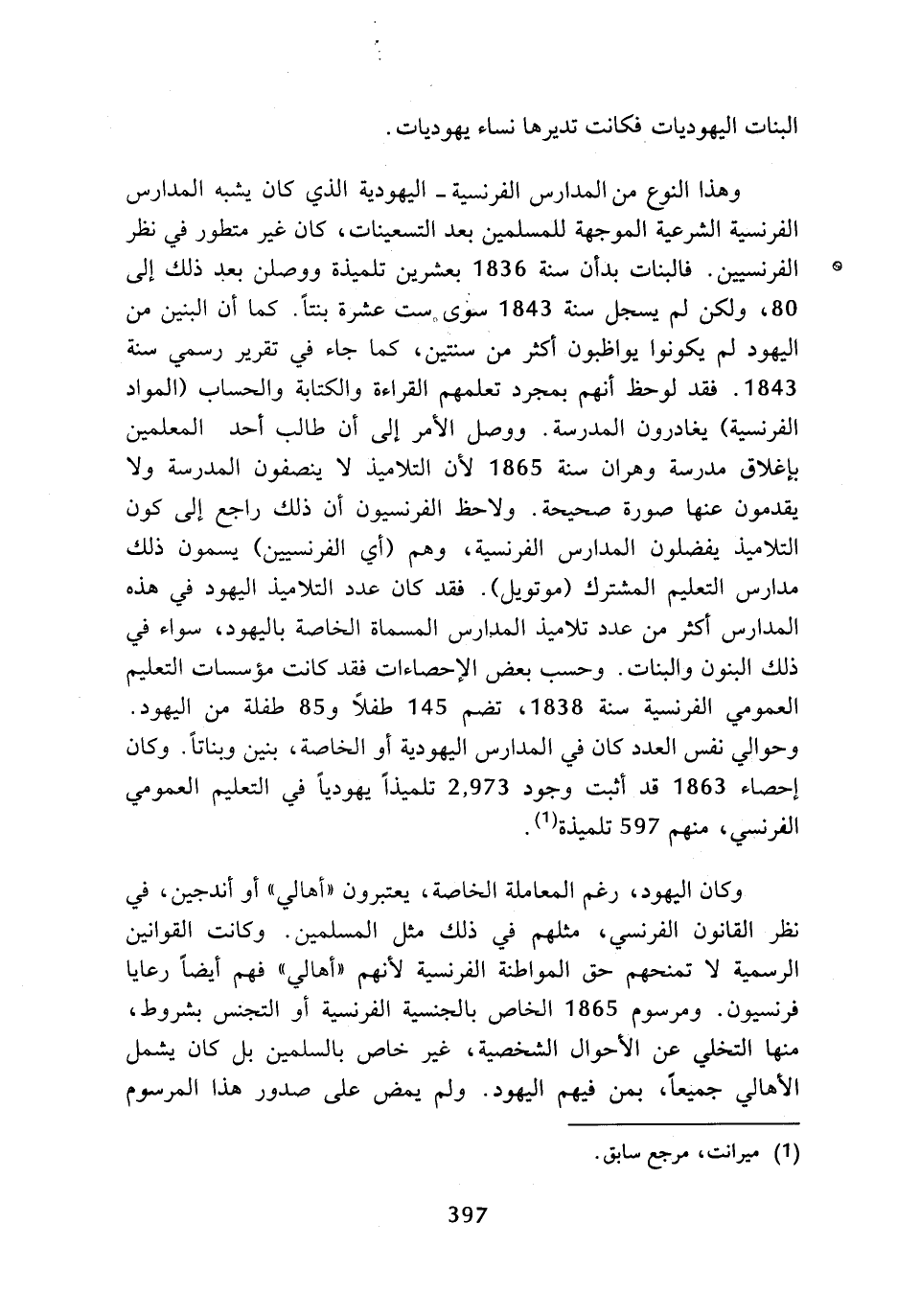 وهذا النوع من المدارس الفرنسية - اليهودية الذي كان يشبه المدارس الفرنسية الشرعية الموجهة للمسلمين بعد التسعينات، كان غير متطور في نظر الفرنسيين. فالبنات بدأن سنة 1836 بعشرين تلميذة ووصلن بعد ذلك إلى 80، ولكن لم يسجل سنة 1843 سوى ست عشرة بنتا. كما أن البنين من اليهود لم يكونوا يواظبون أكثر من سنتين، كما جاء في تقرير رسمي سنة 1843. فقد لوحظ أنهم بمجرد تعلمهم القراءة والكتابة والحساب (المواد الفرنسية) يغادرون المدرسة. ووصل الأمر إلى أن طالب أحد المعلمين بإغلاق مدرسة وهران سنة 1865 لأن التلاميذ لا ينصفون المدرسة ولا يقدمون عنها صورة صحيحة. ولاحظ الفرنسيون أن ذلك راجع إلى كون التلاميذ يفضلون المدارس الفرنسية، وهم (أي الفرنسيين) يسمون ذلك مدارس التعليم المشترك (موتويل). فقد كان عدد التلاميذ اليهود في هذه المدارس أكثر من عدد تلاميذ المدارس المسماة الخاصة باليهود، سواء في ذلك البنون والبنات. وحسب بعض الإحصاءات فقد كانت مؤسسات التعليم العمومي الفرنسية سنة 1838، تضم 145 طفلا و 85 طفلة من اليهود. وحوالي نفس العدد كان في المدارس اليهودية أو الخاصة، بنين وبناتا. وكان إحصاء 1863 قد أثبت وجود 2,973 تلميذا، يهوديا في التعليم العمومي الفرنسي، منهم 597 تلميذة (¬1).
