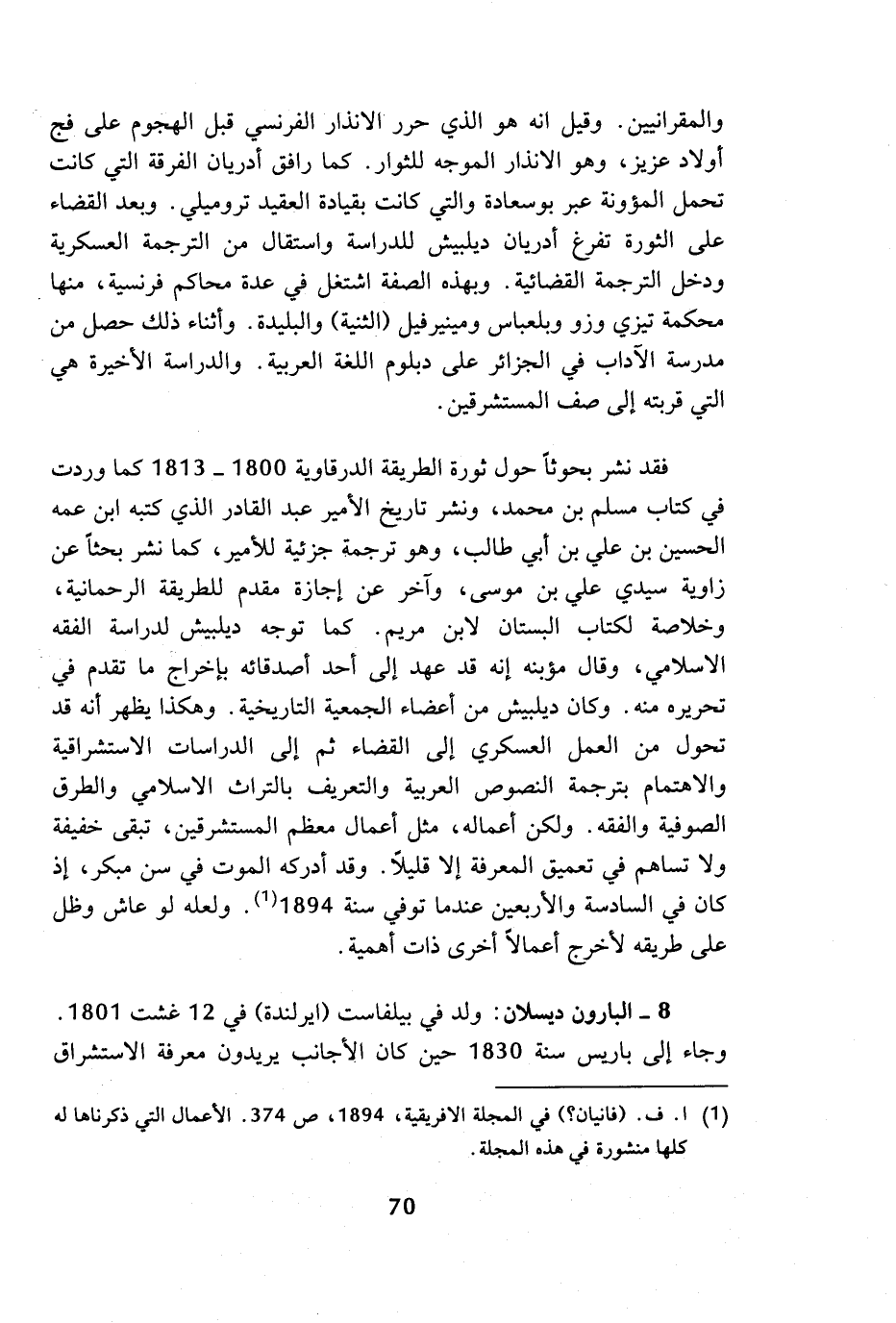 8 - البارون ديسلان: ولد في بيلفاست (ايرلندة) في 12 غشت 1801. وجاء إلى باريس سنة 1830 حين كان الأجانب يريدون معرفة الاستشراق