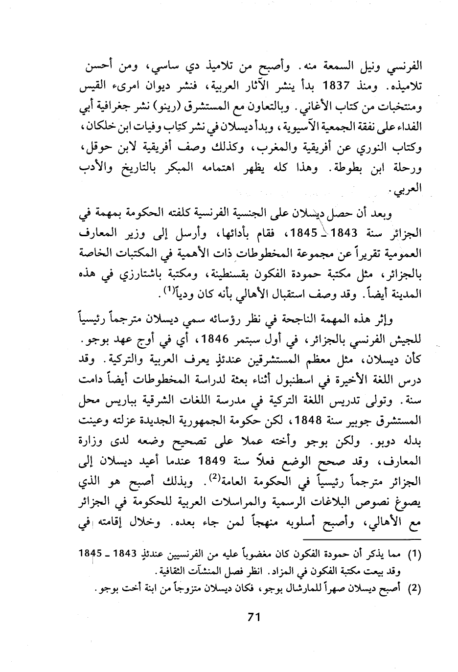 وإثر هذه المهمة الناجحة في نظر رؤسائه سمي ديسلان مترجما رئيسيا للجيش الفرنسي بالجزائر، في أول سبتمر 1846، أي في أوج عهد بوجو. كأن ديسلان، مثل معظم المستشرقين عندئذ يعرف العربية والتركية. وقد درس اللغة الأخيرة في اسطنبول أثناء بعثة لدراسة المخطوطات أيضا دامت سنة. وتولى تدريس اللغة التركية في مدرسة اللغات الشرقية بباريس محل المستشرق جوبير سنة 1848، لكن حكومة الجمهورية الجديدة عزلته وعينت بدله دوبو. ولكن بوجو وأخته عملا على تصحيح وضعه لدى وزارة المعارف، وقد صحح الوضع فعلا سنة 1849 عندما أعيد ديسلان إلى الجزائر مترجما رئيسيا في الحكومة العامة (¬2). وبذلك أصبح هو الذي يصوغ نصوص البلاغات الرسمية والمراسلات العربية للحكومة في الجزائر مع الأهالي، وأصبح أسلوبه منهجا لمن جاء بعده. وخلال إقامته في