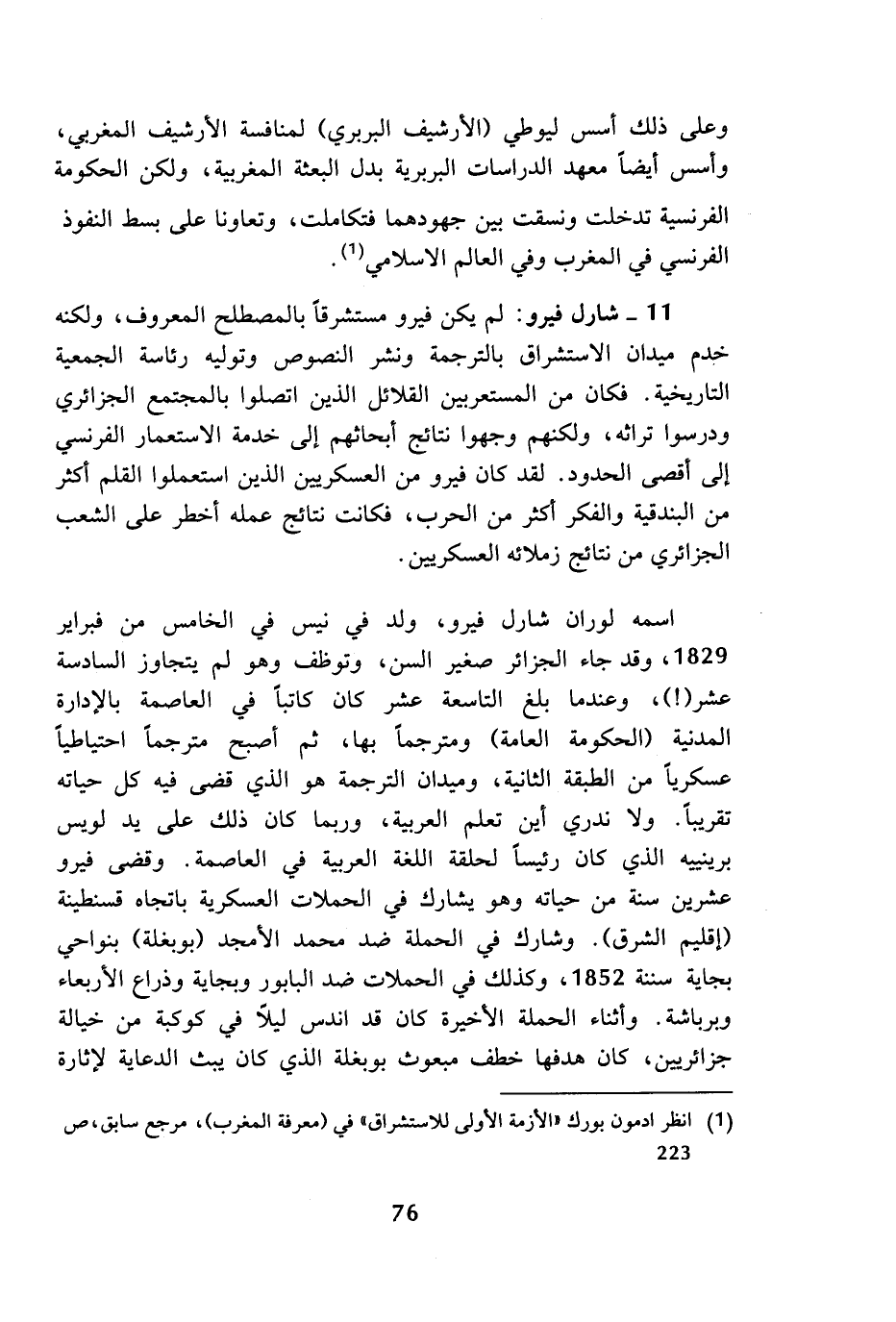 11 - شارل فيرو: لم يكن فيرو مستشرقا بالمصطلح المعروف، ولكنه خدم ميدان الاستشراق بالترجمة ونشر النصوص وتوليه رئاسة الجمعية التاريخية. فكان من المستعربين القلائل الذين اتصلوا بالمجتمع الجزائري ودرسوا تراثه، ولكنهم وجهوا نتائج أبحاثهم إلى خدمة الاستعمار الفرنسي إلى أقصى الحدود. لقد كان فيرو من العسكريين الذين استعملوا القلم أكثر من البندقية والفكر أكثر من الحرب، فكانت نتائج عمله أخطر على الشعب الجزائري من نتائج زملائه العسكريين.