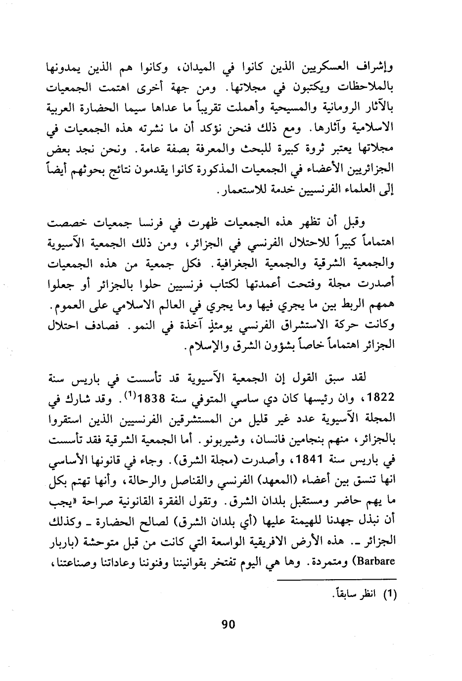 لقد سبق القول إن الجمعية الآسيوية قد تأسست في باريس سنة 1822، وان رئيسها كان دي ساسي المتوفي سنة 1838 (¬1). وقد شارك في المجلة الآسيوية عدد غير قليل من المستشرقين الفرنسيين الذين استقروا بالجزائر، منهم بنجامين فانسان، وشيربونو. أما الجمعية الشرقية فقد تأسست في باريس سنة 1841، وأصدرت (مجلة الشرق). وجاء في قانونها الأساسي انها تنسق بين أعضاء (المعهد) الفرنسي والقناصل والرحالة، وأنها تهتم بكل ما يهم حاضر ومستقبل بلدان الشرق. وتقول الفقرة القانونية صراحة (يجب أن نبذل جهدنا للهيمنة عليها (أي بلدان الشرق) لصالح الحضارة - وكذلك الجزائر -. هذه الأرض الافريقية الواسعة التي كانت من قبل متوحشة (باربار Barbare) ومتمردة. وها هي اليوم تفتخر بقوانيننا وفنوننا وعاداتنا وصناعتنا،
