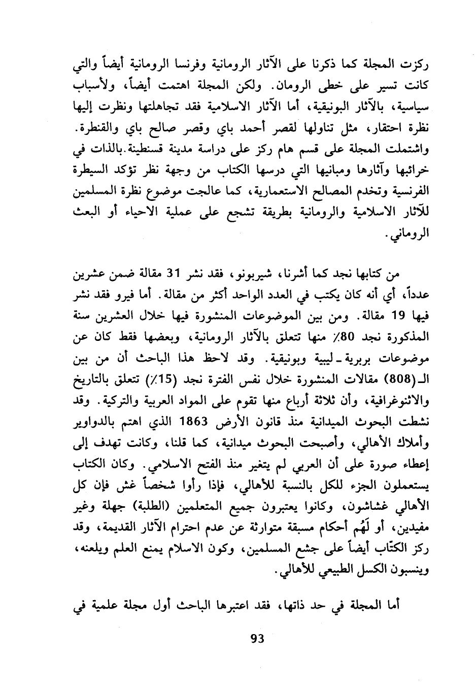 من كتابها نجد كما أشرنا، شيربونو، فقد نشر 31 مقالة ضمن عشرين عددا، أي أنه كان يكتب في العدد الواحد أكثر من مقالة. أما فيرو فقد نشر فيها 19 مقالة. ومن بين الموضوعات المنشورة فيها خلال العشرين سنة المذكورة نجد 80? منها تتعلق بالآثار الرومانية، وبعضها فقط كان عن موضوعات بربرية - ليبية وبونيقية. وقد لاحظ هذا الباحث أن من بين ال (808) مقالات المنشورة خلال نفس الفترة نجد (15?) تتعلق بالتاريخ والاثنوغرافية، وأن ثلاثة أرباع منها تقوم على المواد العربية والتركية. وقد نشطت البحوث الميدانية منذ قانون الأرض 1863 الذي اهتم بالدواوير وأملاك الأهالي، وأصبحت البحوث ميدانية، كما قلنا، وكانت تهدف إلى إعطاء صورة على أن العربي لم يتغير منذ الفتح الاسلامي. وكان الكتاب يستعملون الجزء للكل بالنسبة للأهالي، فإذا رأوا شخصا غش فإن كل الأهالي غشاشون، وكانوا يعتبرون جميع المتعلمين (الطلبة) جهلة وغير مفيدين، أو لهم أحكام مسبقة متوارثة عن عدم احترام الآثار القديمة، وقد ركز الكتاب أيضا على جشع المسلمين، وكون الاسلام يمنع العلم ويلعنه، وينسبون الكسل الطبيعي للأهالي.