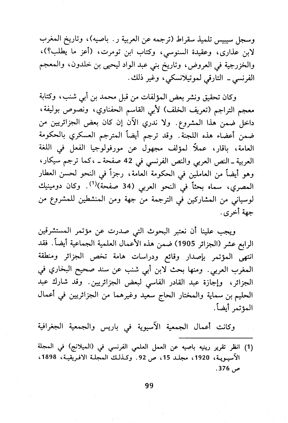 وكان تحقيق ونشر بعض المؤلفات من قبل محمد بن أبي شنب، وكتابة معجم التراجم (تعريف الخلف) لأبي القاسم الحفناوي، ونصوص بوليفة، داخل ضمن هذا المشروع. ولا ندري الآن إن كان بعض الجزائريين من ضمن أعضاء هذه اللجنة. وقد ترجم أيضا المترجم العسكري بالحكومة العامة، باقار، عملا لمؤلف مجهول عن مورفولوجيا الفعل في اللغة العربية - النص العربي والنص الفرنسي في 42 صفحة -، كما ترجم سيكار، وهو أيضا من العاملين في الحكومة العامة، رجزا في النحو لحسن العطار المصري، سماه بحثا في النحو العربي (34 صفحة) (¬1). وكان دومينيك لوسياني من المشاركين في الترجمة من جهة ومن المنشطين للمشروع من جهة أخرى.