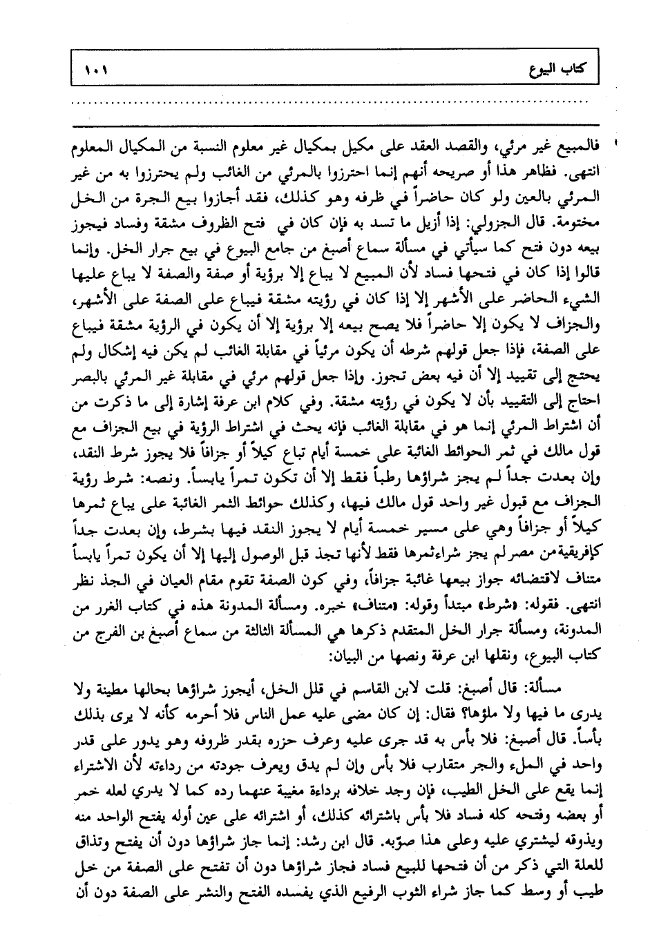 فالمبيع غير مرئي، والقصد العقد على مكيل بمكيال غير معلوم النسبة من المكيال المعلوم انتهى. فظاهر هذا أو صريحه أنهم إنما احترزوا بالمرئي من الغائب، ولم يحترزوا به من غير المرئي بالعين، ولو كان حاضرا في ظرفه وهو كذلك فقد أجازوا بيع الجرة من الخل مختومة قال الجزولي: إذا أزيل ما تسد به فإن كان في فتح الظروف مشقة وفساد، فيجوز بيعه دون فتح كما سيأتي في مسألة سماع أصبغ من جامع البيوع في بيع جرار الخل. وإنما قالوا إذا كان في فتحها فساد؛ لأن المبيع لا يباع إلا برؤية أو صفة والصفة لا يباع عليها الشيء الحاضر على الأشهر إلا إذا كان في رؤيته مشقة فيباع على الصفة على الأشهر والجزاف لا يكون إلا حاضرا فلا يصح بيعه إلا برؤية إلا أن يكون في الرؤية مشقة فيباع على الصفة فإذا جعل قولهم شرطه أن يكون مرئيا في مقابل الغائب لم يكن فيه إشكال، ولم يحتج إلى تقييد إلا أن فيه بعض تجوز، وإذا جعل قولهم مرئي في مقابلة غير المرئي بالبصر احتاج إلى التقييد بأن لا يكون في رؤيته مشقة، وفي كلام ابن عرفة إشارة إلى ما ذكرت من أن اشتراط المرئي إنما هو في مقابلة الغائب فإنه بحث في اشتراط الرؤية في بيع الجزاف مع قول مالك في ثمر الحوائط الغائبة على خمسة أيام تباع كيلا أو جزافا، فلا يجوز شرط النقد وإن بعدت جدا لم يجز شراؤها رطبا فقط إلا أن تكون تمرا يابسا، ونصه شرط رؤية الجزاف مع قبول غير واحد قول مالك فيها: وكذلك حوائط الثمر الغائبة يباع ثمرها كيلا أو جزافا، وهي على مسير خمسة أيام لا يجوز النقد فيها بشرط، وإن بعدت جدا كإفريقية من مصر لم يجز شراء ثمرها فقط؛ لأنها تجذ قبل الوصول إليها إلا أن يكون تمرا يابسا متناف لاقتضائه جواز بيعها غائبة جزافا، وفي كون الصفة تقوم مقام العيان في الجذ نظر انتهى. فقوله شرط مبتدأ وقوله: "متناف" خبره. ومسألة المدونة هذه في كتاب الغرر من المدونة، ومسألة جرار الخل المتقدم ذكرها هي المسألة الثالثة من سماع أصبغ بن الفرج من كتاب البيوع، ونقلها ابن عرفة، ونصها من البيان: