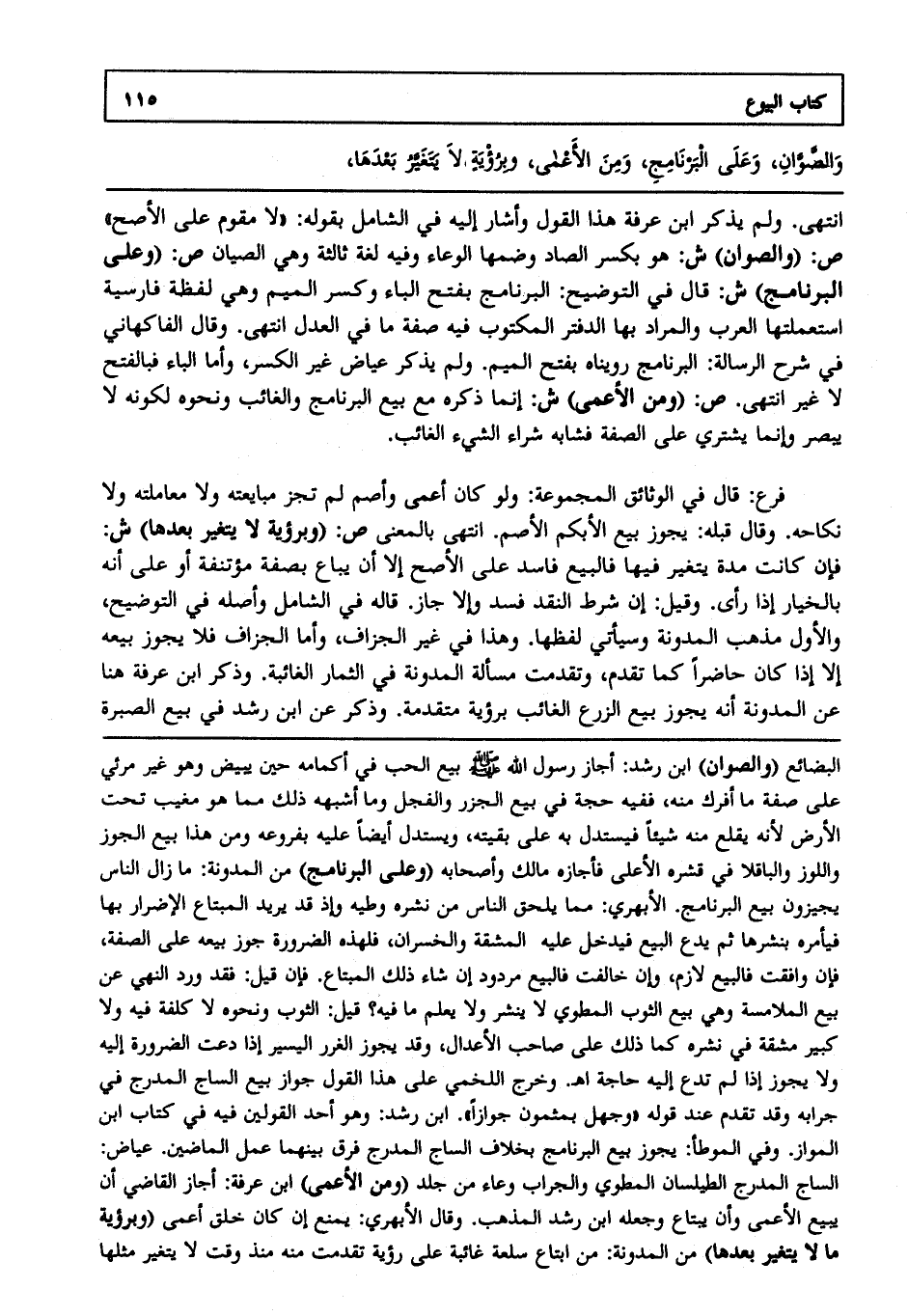 انتهى. ولم يذكر ابن عرفة هذا القول، وأشار إليه في الشامل بقوله لا مقوم على الأصح ص: (والصوان) ش: هو بكسر الصاد، وضمها الوعاء، وفيه لغة ثالثة، وهي الصيان ص: (وعلى البرنامج) ش: قال في التوضيح البرنامج بفتح الباء، وكسر الميم، وهي لفظة فارسية استعملها العرب والمراد بها الدفتر المكتوب فيه صفة ما في العدل انتهى. وقال الفاكهاني في شرح الرسالة البرنامج رويناه بفتح الميم ولم يذكر عياض غير الكسر وأما الباء فبالفتح لا غير انتهى ص: (ومن الأعمى) ش: إنما ذكره مع بيع البرنامج والغائب، ونحوه لكونه لا يبصر وإنما يشتري على الصفة فشابه شراء الشيء الغائب,