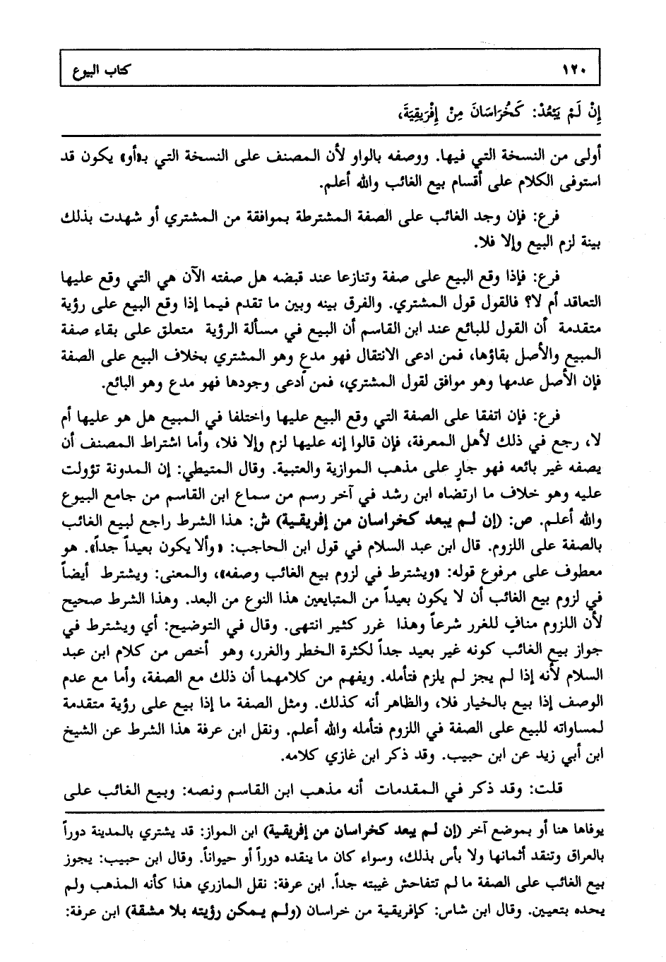 فرع: فإن اتفقا على الصفة التي وقع البيع عليها واختلفا في المبيع هل هو عليها أم لا رجع في ذلك لأهل المعرفة فإن قالوا إنه عليها لزم، وإلا فلا. وأما اشتراط المصنف أن يصفه غير بائعه فهو جار على مذهب الموازية والعتبية وقال المتيطي: إن المدونة تؤولت عليه، وهو خلاف ما ارتضاه ابن رشد في آخر رسم من سماع ابن القاسم من جامع البيوع، والله أعلم. ص: (إن لم يبعد كخراسان من إفريقية) ش: هذا الشرط راجع لبيع الغائب بالصفة على اللزوم قال ابن عبد السلام: في قول ابن الحاجب، "وألا يكون بعيدا جدا" هو معطوف على مرفوع قوله، "ويشترط في لزوم بيع الغائب وصفه" والمعنى ويشترط أيضا في لزوم بيع الغائب أن لا يكون بعيدا من المتبايعين هذا النوع من البعد، وهذا الشرط صحيح؛ لأن اللزوم مناف للغرر شرعا، وهذا غرر كثير انتهى. وقال في التوضيح: أي، ويشترط في جواز بيع الغائب كونه غير بعيد جدا لكثرة الخطر، والغرر، وهو أخص من كلام ابن عبد السلام؛ لأنه إذا لم يجز لم يلزم فتأمله ويفهم من كلامهما أن ذلك مع الصفة، وأما مع عدم الوصف إذا بيع بالخيار فلا، والظاهر أنه كذلك، ومثل الصفة ما إذا بيع على رؤية متقدمة لمساواته للبيع على الصفة في اللزوم فتأمله والله أعلم. ونقل ابن عرفة هذا الشرط عن الشيخ ابن أبي زيد عن ابن حبيب وقد ذكر ابن غازي كلامه.