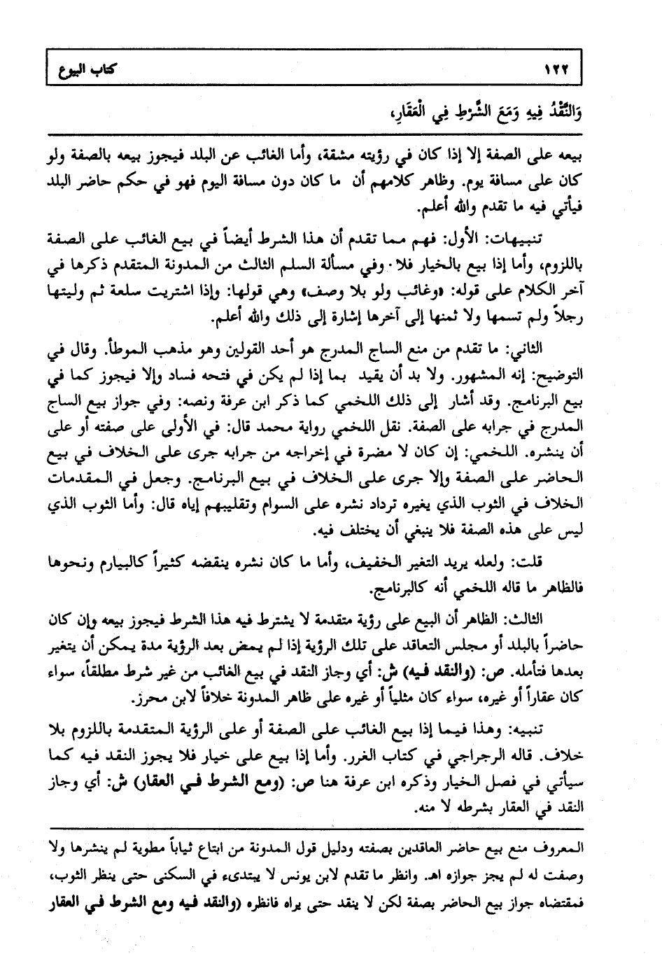 تنبيه: وهذا فيما إذا بيع الغائب على الصفة أو على الرؤية المتقدمة باللزوم بلا خلاف قاله الرجراجي في كتاب الغرر، وأما إذا بيع على خيار، فلا يجوز النقد فيه كما سيأتي في فصل الخيار. وذكره ابن عرفة هنا ص: (ومع الشرط في العقار) ش: أي وجاز النقد في العقار بشرطه لا منه.