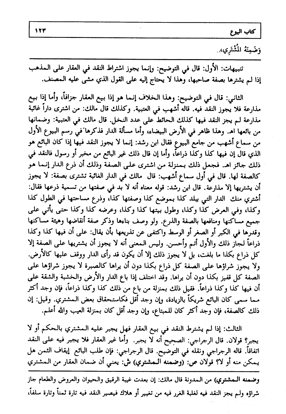 الثالث: إذا لم يشترط النقد في بيع العقار فهل يجبر عليه المشتري بالحكم أو لا يجبر قولان قال الرجراجي الصحيح أنه لا يجبر، وأما غير العقار فلا يجبر فيه على النقد اتفاقا قاله الرجراجي، ونقله في التوضيح قال الرجراجي: فإن طلب البائع إيقاف الثمن هل يمكن منه أو لا ؟ قولان ص: (وضمنه المشتري) ش: يعني أن ضمان العقار من المشتري