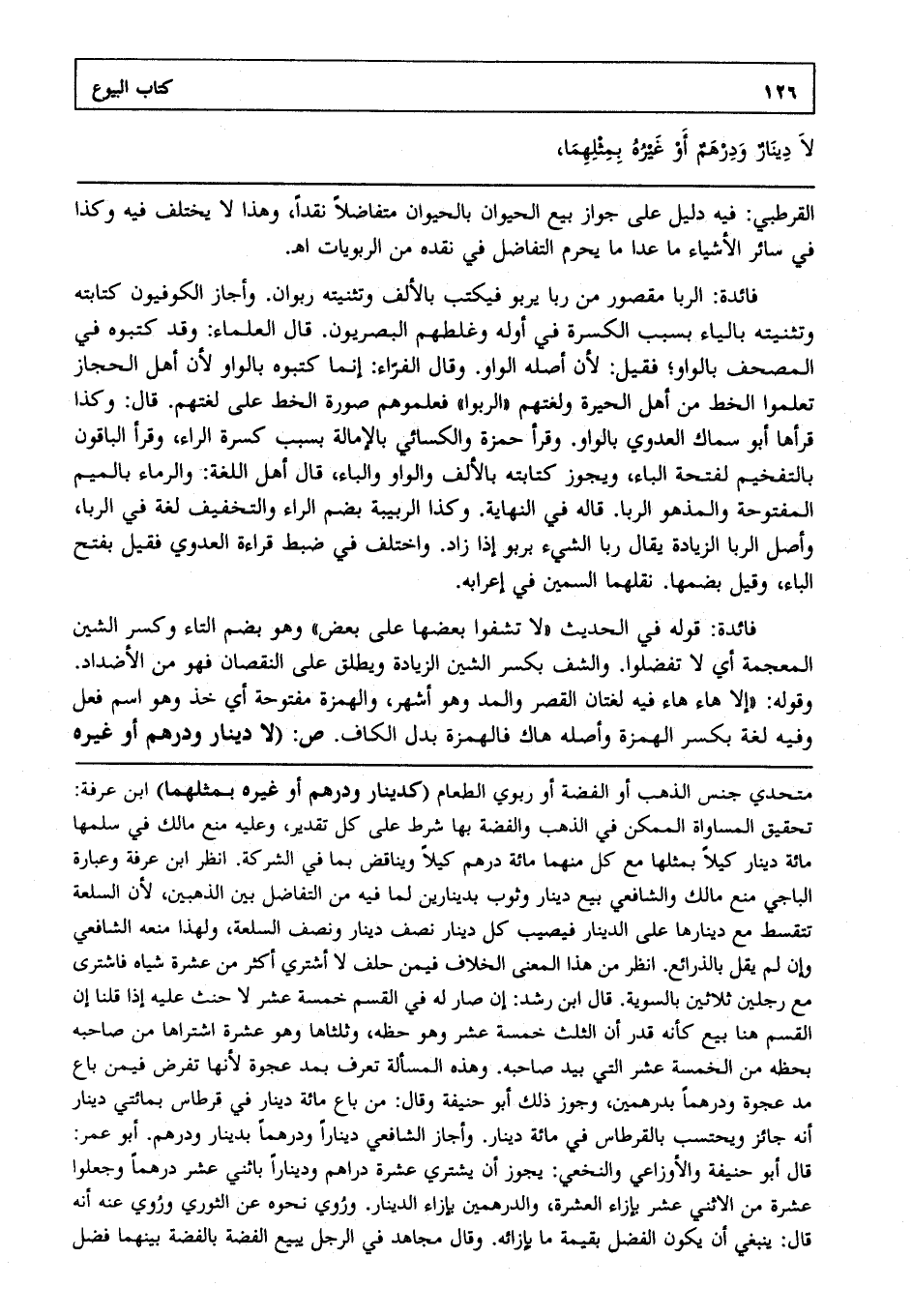 فائدة: الربا مقصور من ربا يربو فيكتب بالألف، وتثنيته ربوان، وأجاز الكوفيون كتابته وتثنيته بالياء بسبب الكسرة في أوله وغلطهم البصريون قال العلماء: وقد كتبوه في المصحف بالواو فقيل؛ لأن أصله الواو وقال الفراء: إنما كتبوه بالواو لأن أهل الحجاز تعلموا الخط من أهل الحيرة ولغتهم "الربوا" فعلموهم صورة الخط على لغتهم قال: وكذا قرأها أبو سماك العدوي: بالواو وقرأ حمزة والكسائي بالإمالة بسبب كسرة الراء وقرأ الباقون بالتفخيم لفتحة الباء، ويجوز كتابته بالألف والواو، والياء قال أهل اللغة والرماء بالميم المفتوحة والمد هو الربا قاله في النهاية، وكذا الرببة بضم الراء، والتخفيف لغة في الربا، وأصل الربا الزيادة يقال ربا الشيء يربو إذا زاد واختلف في ضبط قراءة العدوي فقيل بفتح الباء، وقيل بضمها نقلهما السمين في إعرابه.
