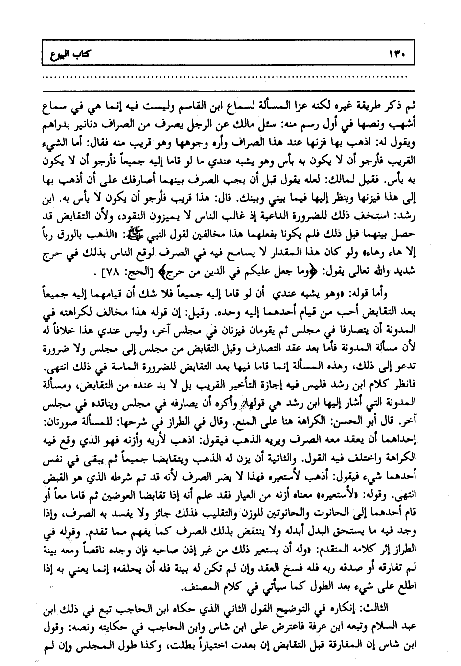 ثم ذكر طريقة غيره لكنه عزا المسألة لسماع ابن القاسم، وليست فيه إنما هي في سماع أشهب ونصها في أول رسم منه سئل مالك عن الرجل يصرف من الصراف دنانير بدراهم، ويقول له: اذهب بها فزنها عند هذا الصراف، وأره وجوهها، وهو قريب منه فقال: أما الشيء القريب فأرجو أن لا يكون به بأس، وهو يشبه عندي ما لو قاما إليه جميعا فأرجو أن لا يكون به بأس فقيل لمالك لعله يقول قبل أن يجب الصرف بينهما أصارفك على أن أذهب بها إلى هذا فيزنها وينظر إليها فيما بيني، وبينك قال هذا قريب فأرجو أن يكون لا بأس به، ابن رشد استخف ذلك للضرورة الداعية إذ غالب الناس لا يميزون النقود؛ ولأن التقابض قد حصل بينهما قبل ذلك فلم يكونا بفعلهما هذا مخالفين "لقول النبي صلى الله عليه وسلم " الذهب بالورق ربا إلا هاء وهاء" ولو كان هذا المقدار لا يسامح فيه في الصرف لوقع الناس بذلك في حرج شديد، والله تعالى يقول {وَمَا جَعَلَ عَلَيْكُمْ فِي الدِّينِ مِنْ حَرَجٍ} [الحج:78].