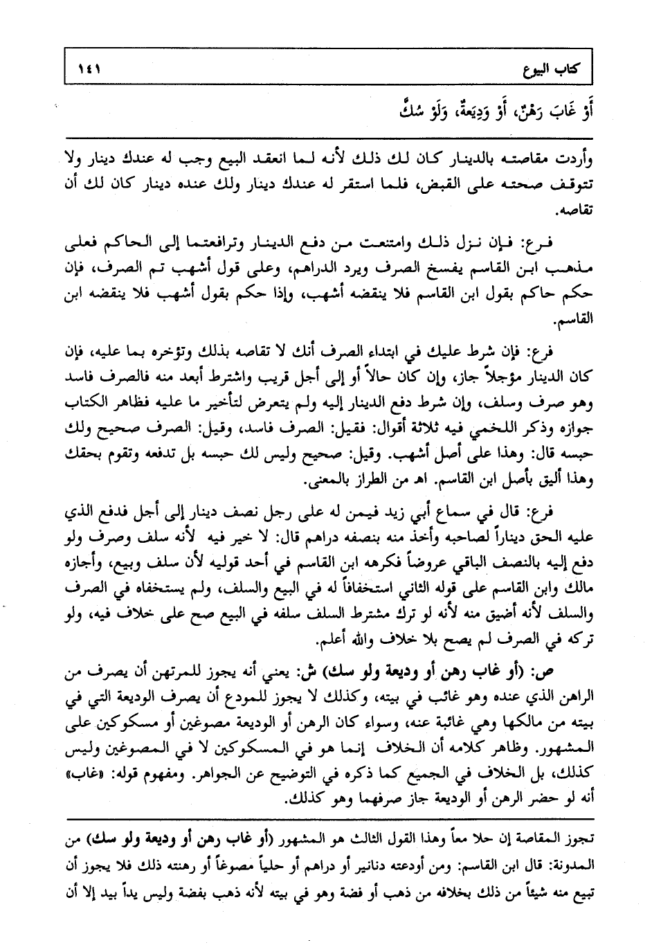 ص: (أو غاب رهن أو وديعة ولو سك) ش: يعني أنه لا يجوز للمرتهن أن يصرف من الراهن الذي عنده، وهو غائب في بيته، وكذلك لا يجوز للمودع أن يصرف الوديعة التي في بيته من مالكها وهي غائبة عنه وسواء كان الرهن أو الوديعة مصوغين أو مسكوكين على المشهور وظاهر كلامه أن الخلاف إنما هو في المسكوكين لا في المصوغين وليس كذلك، بل الخلاف في الجميع كما ذكره في التوضيح عن الجواهر. ومفهوم قوله "غاب" أنه لو حضر الرهن أو الوديعة جاز صرفهما، وهو كذلك.