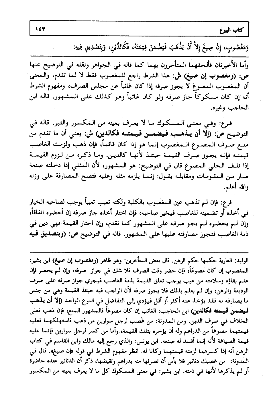 فرع: وفي معنى المسكوك ما لا يعرف بعينه من المكسور والتبر قاله في التوضيح. ص: (إلا أن يذهب فيضمن قيمته فكالدين) ش: يعني أن ما تقدم من منع صرف المصوغ المغصوب إنما هو إذا كان قائما فإن ذهب ولزمت الغاصب قيمته فإنه يجوز صرف القيمة حينئذ؛ لأنها كالدين وما ذكره من لزوم القيمة إذا تلف الحلي المصوغ، قال في التوضيح: هو المشهور؛ لأن المثلي إذا دخلته صنعة صار من المقومات ومقابله يقول: إنما يلزمه مثله وعليه فتصح المصارفة على وزنه، والله أعلم.