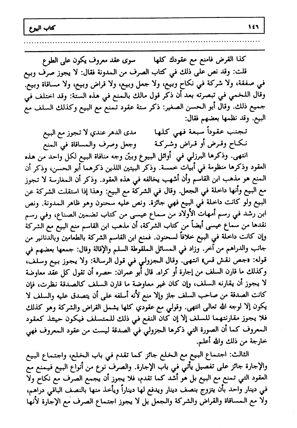 انتهى. وذكرها البرزلي في أوائل البيوع وبين وجه منافاة البيع لكل واحد من هذه العقود وذكرها منظومة في أبيات خمسة وذكر البيتين اللذين ذكرهما أبو الحسن وذكر أن المنع هو مذهب ابن القاسم، وأن أشهب يخالفه في هذه العقود، وذكر أن المغارسة لا تجوز مع البيع، وأنها داخلة في الجعل، وقال في الشركة مع البيع: وهذا إذا استقلت الشركة عن البيع ولو كانت داخلة في البيع فهي جائزة، نص عليه سحنون، وهو ظاهر المدونة ونص ابن رشد في رسم أمهات الأولاد من سماع عيسى من كتاب تضمين الصناع وفي رسم نقدها من سماع عيسى أيضا من كتاب الشركة أن مذهب ابن القاسم منع البيع مع الشركة، وإن كانت داخلة في البيع خلافا لسحنون فمنع ابن القاسم الشركة بالطعامين وبالدنانير من جانب والدراهم من آخر وزاد في المسائل الملقوطة السلم والإقالة، وقال: جمعها بعضهم في قوله "جص نقش قس" انتهى، وقال الجزولي في قول الرسالة: ولا يجوز بيع وسلف وكذلك ما قارن السلف من إجارة أو كراء قال أبو عمران حصره أن تقول: كل عقد معاوضة لا يجوز أن يقارنه السلف، وإن كان غير معاوضة ما قارن السلف كالصدقة نظرت فإن كانت الصدقة من صاحب السلف جاز وإلا منع؛ لأنه أسلفه على أن يتصدق عليه والسلف لا يكون إلا لوجه الله تعالى انتهى. وقولي مع عقودي كلها يشمل القراض والشركة، وهو كذلك فلا يجوز مقارنتهما للسلف إلا إن كان النفع في ذلك للمتسلف فيكون حينئذ كعقود المعروف كما أن الصورة التي ذكرها الجزولي في الصدقة ليست من عقود المعروف فهي خارجة من ذلك، والله أعلم.